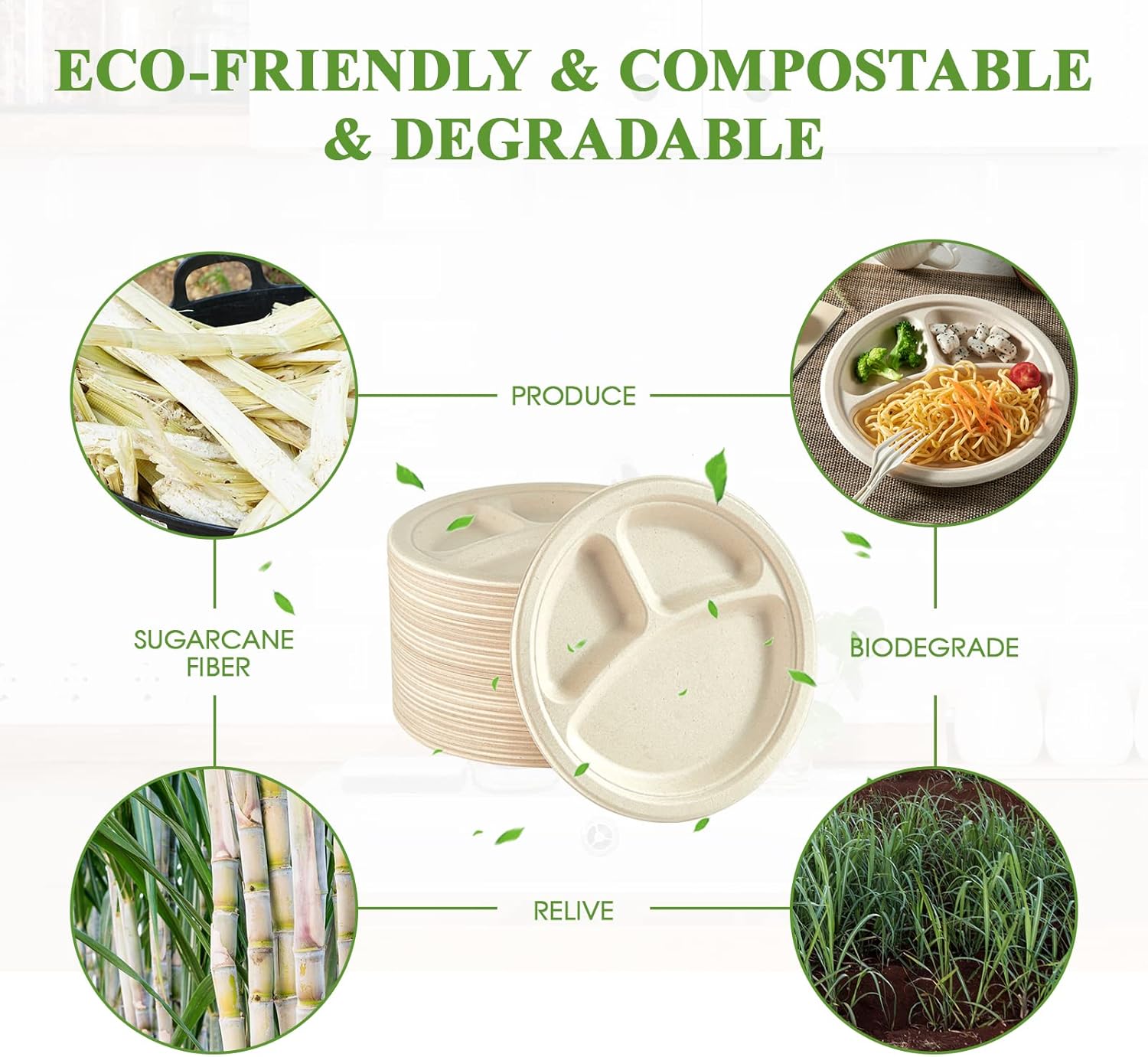 - Good For Environment: Made from sustainably sourced sugarcane fibers, these 9-inch 3 compartment plates are 100% biodegradable and backyard compostable, making these paper plates good for the environment
