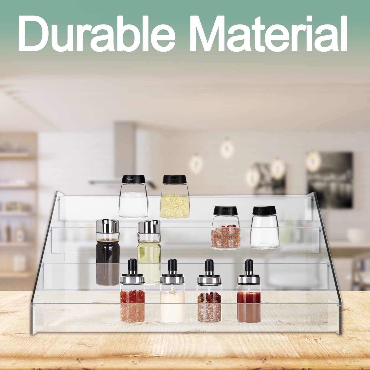 - EASY TO USE: The tiered kitchen countertop organizer can easily help you organize spice bottles and keep your countertop tidy at all times. Layered transparent spice stairs give you maximum visibility and easy access to spices while cooking in the kitchen.