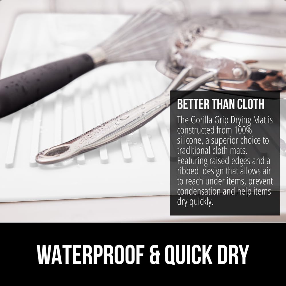 GORILLA GRIP 100% BPA-Free Patented Silicone Dish Drying Mat for Kitchen Counter, Water Catching Ribbed Design, Easy Clean Waterproof Sink Liner, Heat Resistant, Fits Under Rack, 16x12 Inch, White
