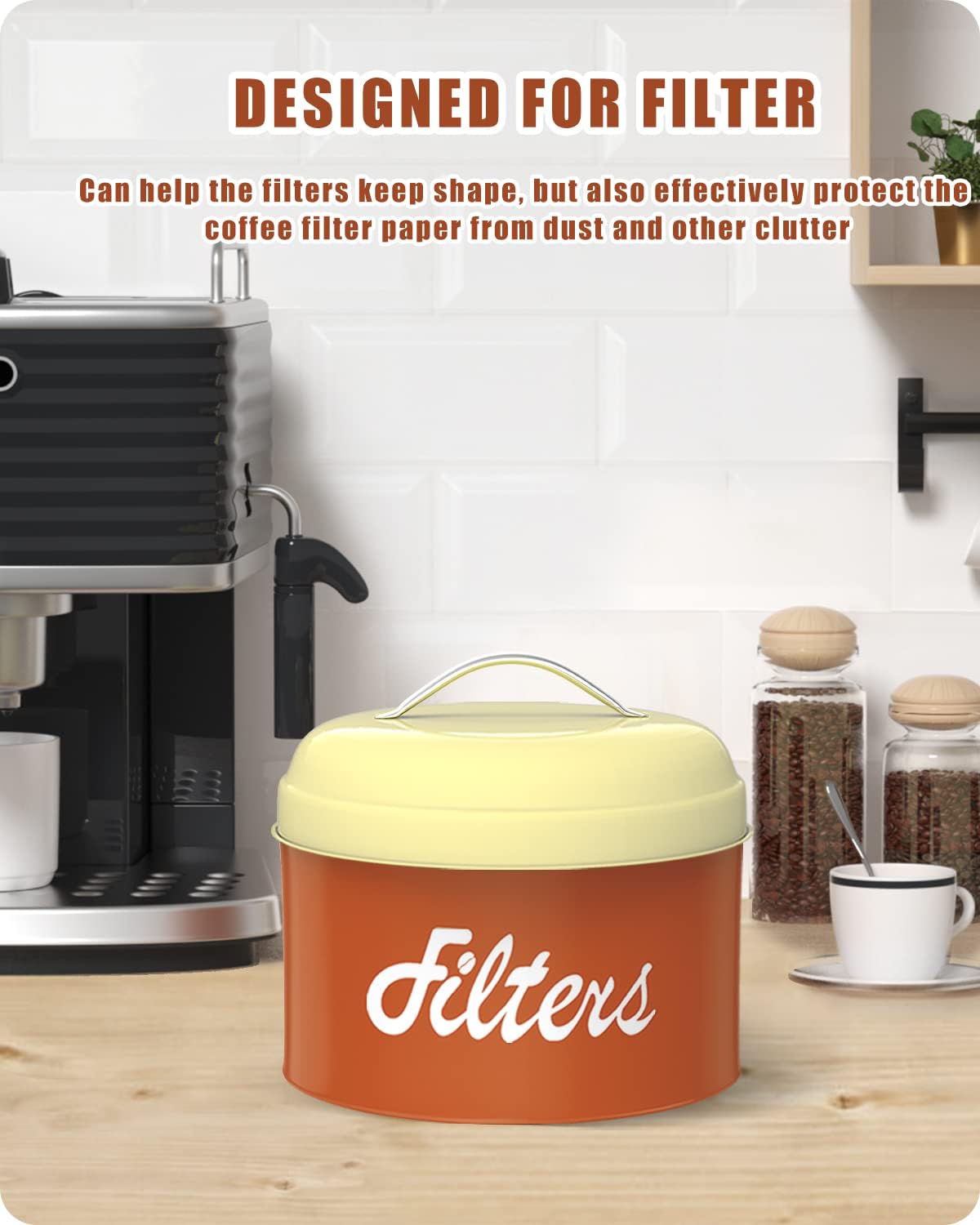 - COFFEE BAR DECOR ACCESSORIES : This coffee filter storage is great way to hide unsightly coffee filters without taking up space anymore! It is a nice addition to your coffee bar decor. The round can be placed anywhere near the coffee machine, on the counter or on a shelf, it is easier to reach than a wall-mounted coffee filter holder and saves you brewing time