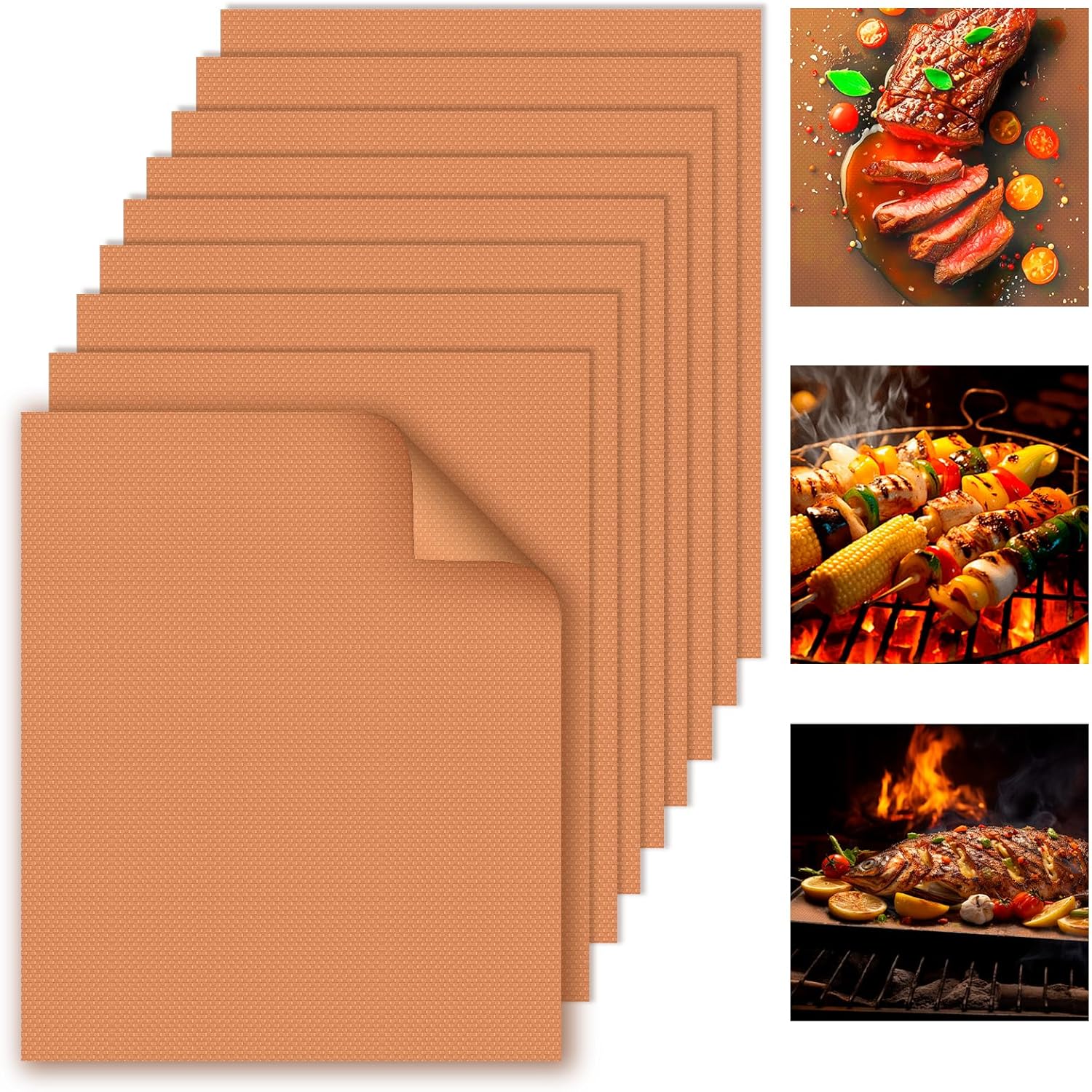 - 100% Safe & Non-Stick: 100% Non-Stick bbq grill mat mean you could grill without grease.The copper grill mat prevents even the smallest morsels from falling through the grates. Keep your grill looking like brand-new and no more clean-up of your dirty grill