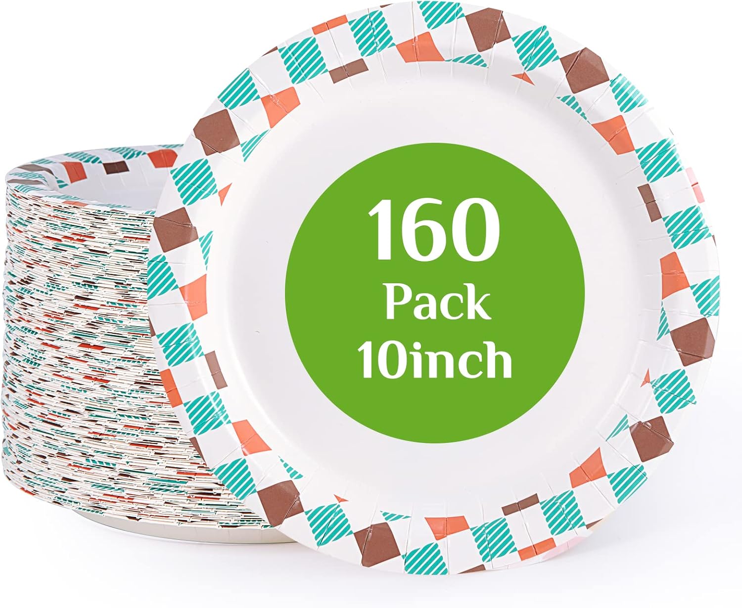 FOCUSLINE 10 inch Paper Plates, Disposable Paper Plates 10 inch Bulk 160 Count, Soak-Proof & Cut-Proof Bulk Plate for Parties, Picnic and Family Gatherings.