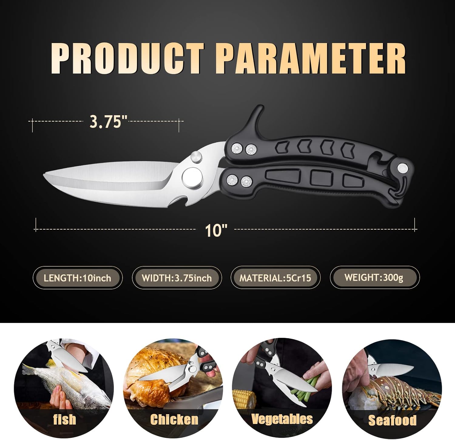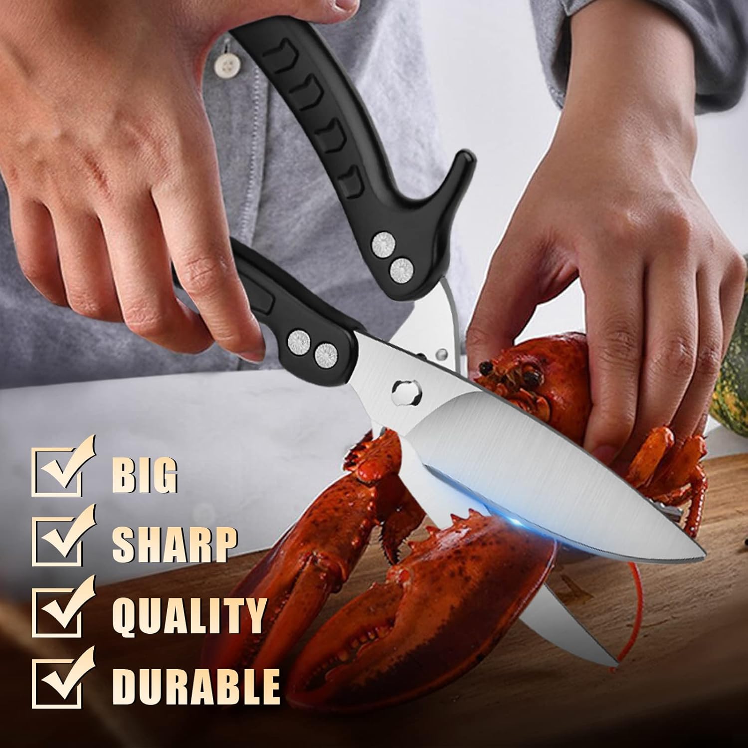 - Easy To Use and Maintain--The ergonomically designed handles of the kitchen shears and the seafood scissors will offer you a soft and secure grip while you use the multipurpose cutting tools. When it is not in use, you can lock the handle for easy store.