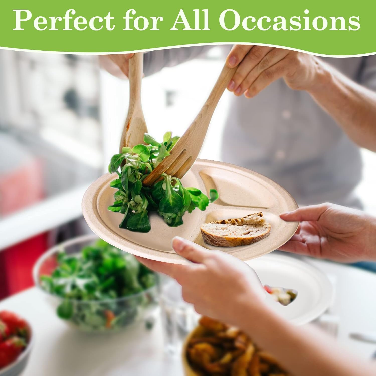 - Compostable Plates: Made from sugarcane fibers and bamboo, which is a sustainable, renewable and biodegradable material. These compostable paper plates are earth-friendly and OK compost-certified.