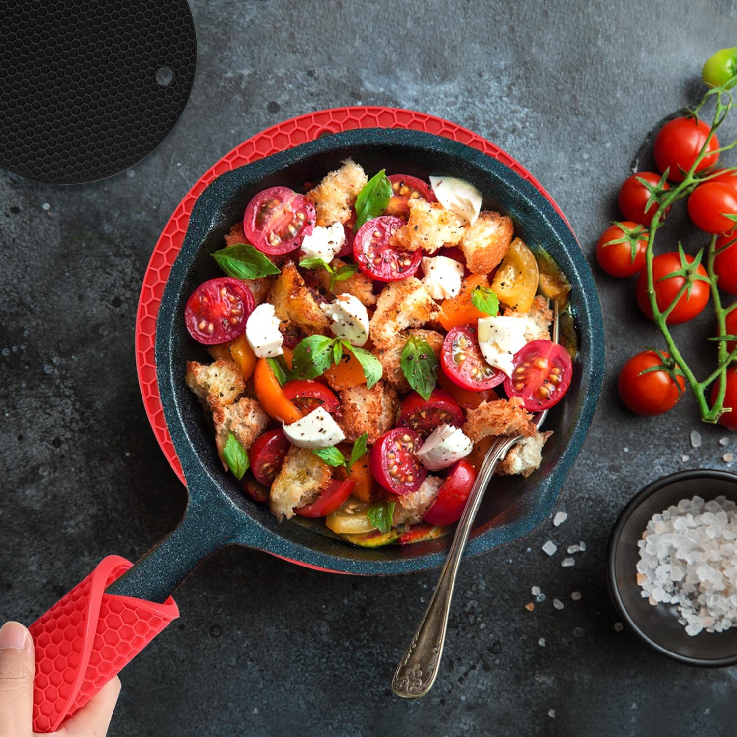 - 💝【PERFECT DESIGN &COMBINATION】:Honeycomb graphic design gives the kitchen nature symbol, means no more spills for liquids, and offers a nonslip surface; the red hot pads for table can distribute heat to protect our hands and provide insulation protects the countertop. Include 2pcs 6.9'' regular and 2pcs 8.7'' large red silicone trivets for hot pots and pans, suitable for small plates or large casseroles.