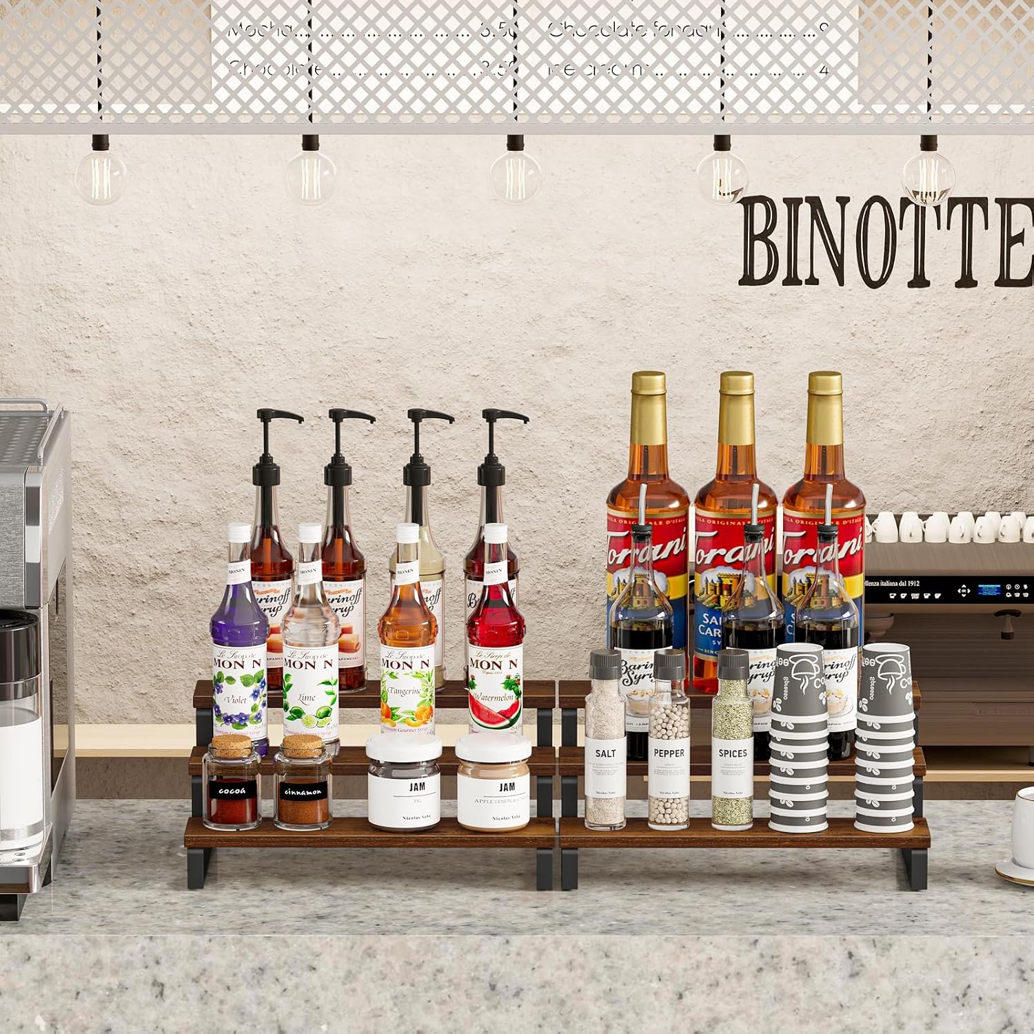 - Convenient Design: The size of this spice organizer: 13.8”L x 9.5”W x 6”H. The stepped design allows your spice bottles, jars, coffee syrup bottles, condiments and spices to be clearly classified and fully displayed, you can find them quickly when you need them while cooking, avoiding panic. It is a perfect holiday gift for Mother's Day and Father's Day!