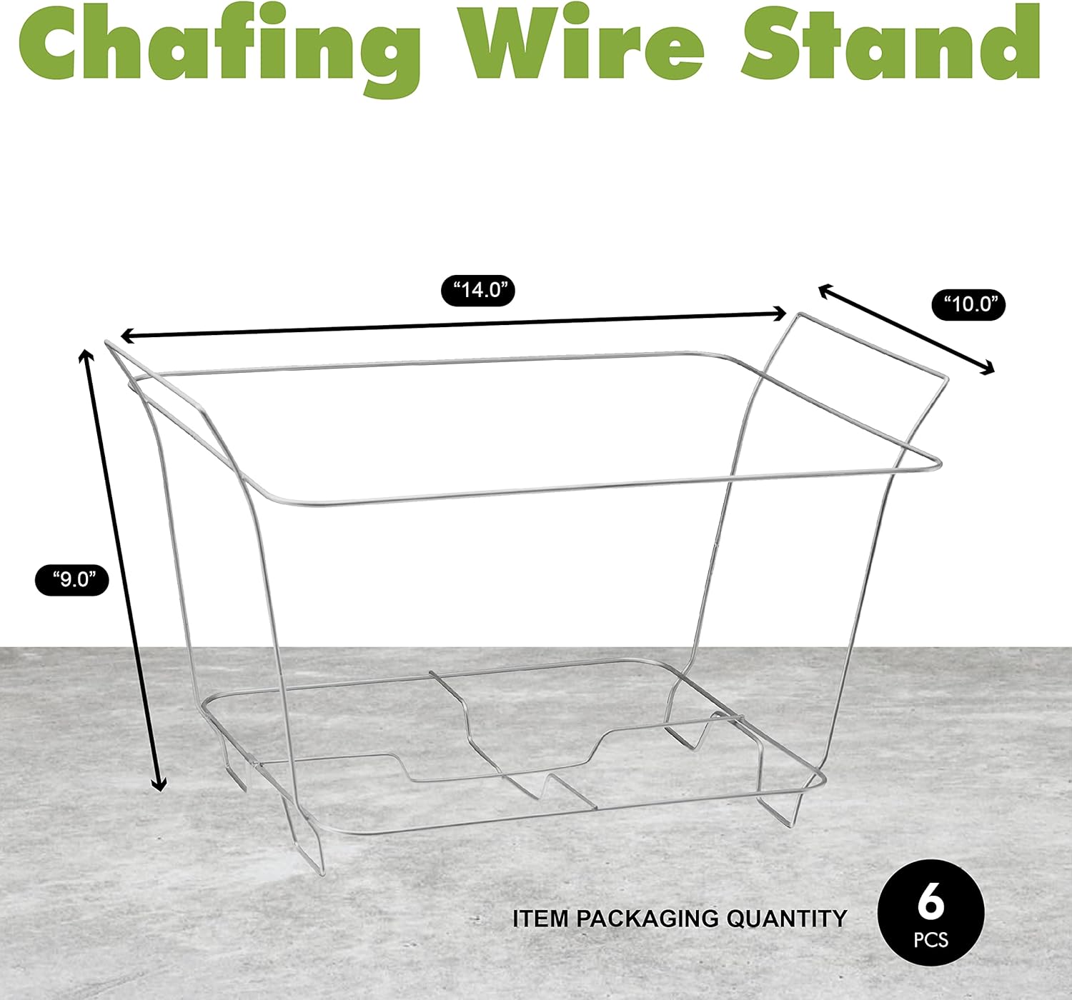 - 9x13 COMPLETE CHAFING SET FOR YOU: Get everything you need for your party food warmer with our chafing dish buffet set disposable. This catering set includes 39 clean, damage-free pieces: 6 half-size chafing dish wire racks, 6 half-size aluminum water pans, 6 half-size food pans, 6 foil lids, 9 serving utensils (3 forks, 3 spoons, 3 tongs), 6 gel cans (each gel can lasts up to 2.5 hours).