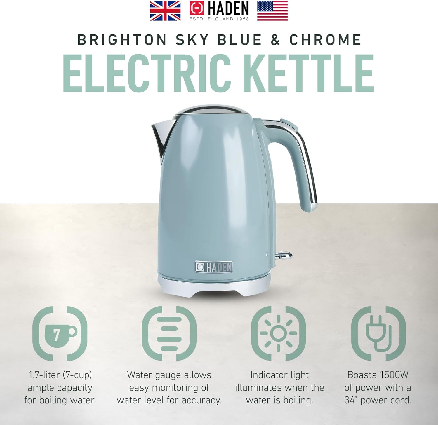 Haden Brighton Electric Kettle, Cordless 1.7 Liter Hot Water Boiler with Chrome Accents, Retro Style, and Auto Shut Off, Sky Blue