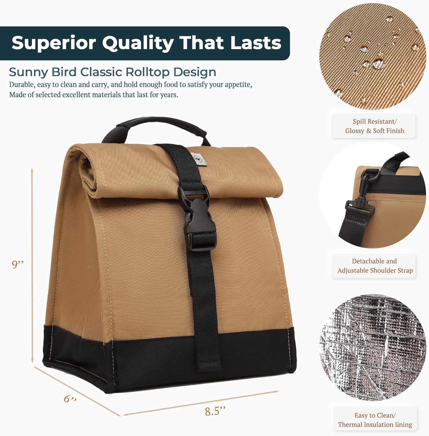 SUNNY BIRD Insulated Lunch Bag Rolltop Lunch Box Tote Bag for Women, Men, Adults and Teens (Brown)