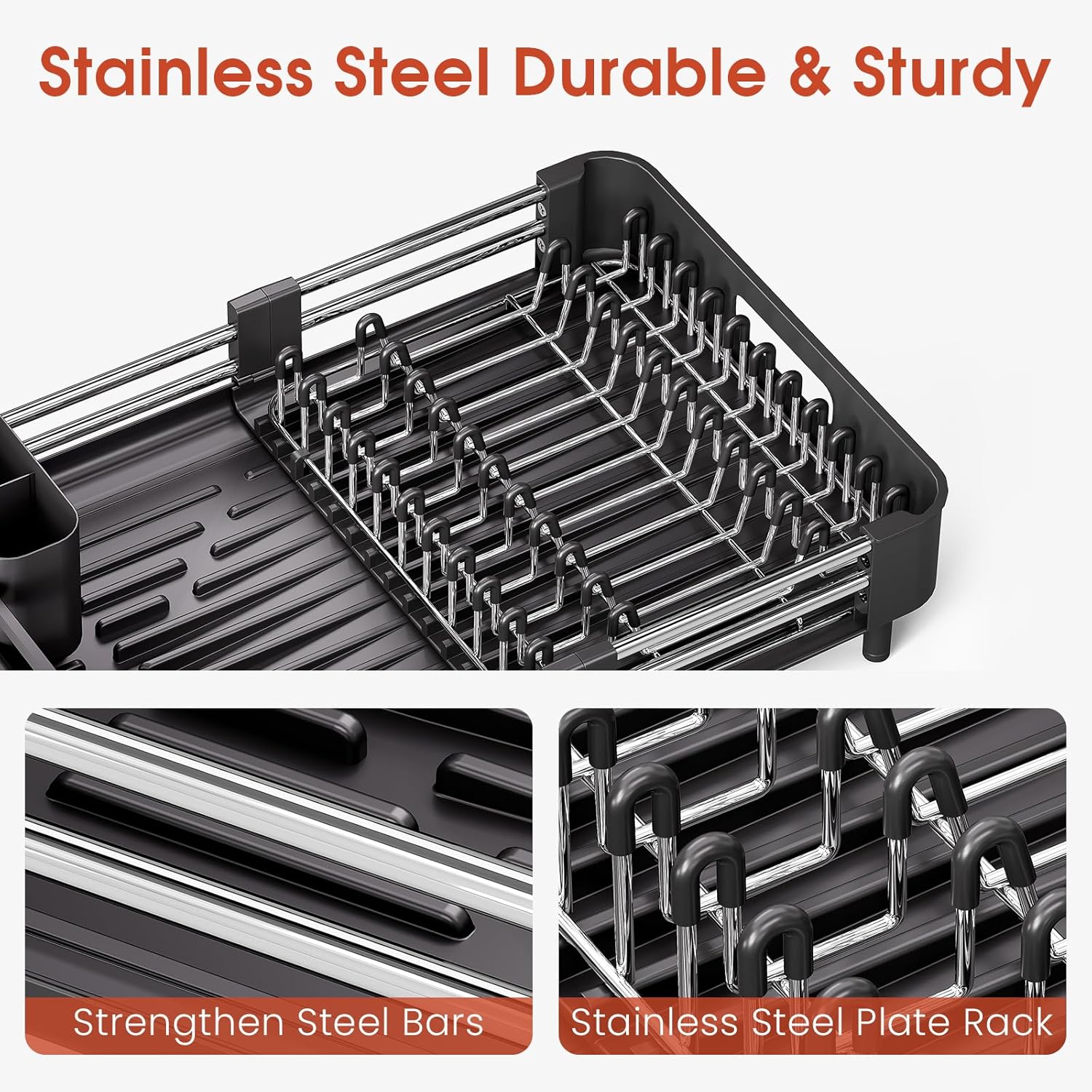 Dish Drying Rack for Kitchen Counter, Extendable Dish Rack with Drainboard, Expandable Dish Drainer, Collapsible Dish Strainer with Cutlery Holder, Foldable Home Countertop Plate Storage Rack, Black