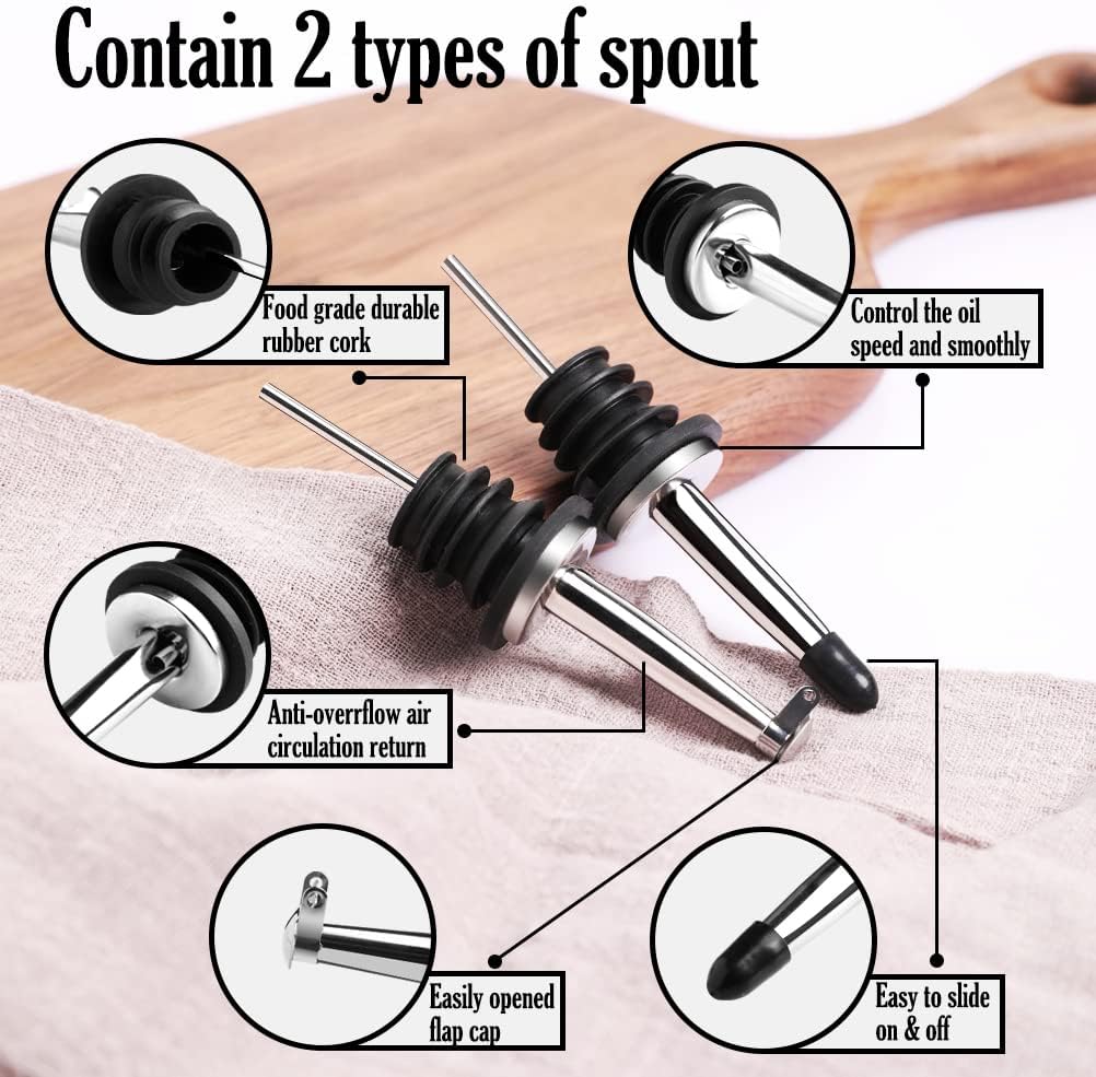 - Two Controlled Pouring Spouts - 18/8 Stainless steel pour spouts with sealed cap or flap cap, fit the bottle well and keep dust out. The pouring fluid is smooth without sticking and can easily dispense the right amount of oil for a healthy diet.
