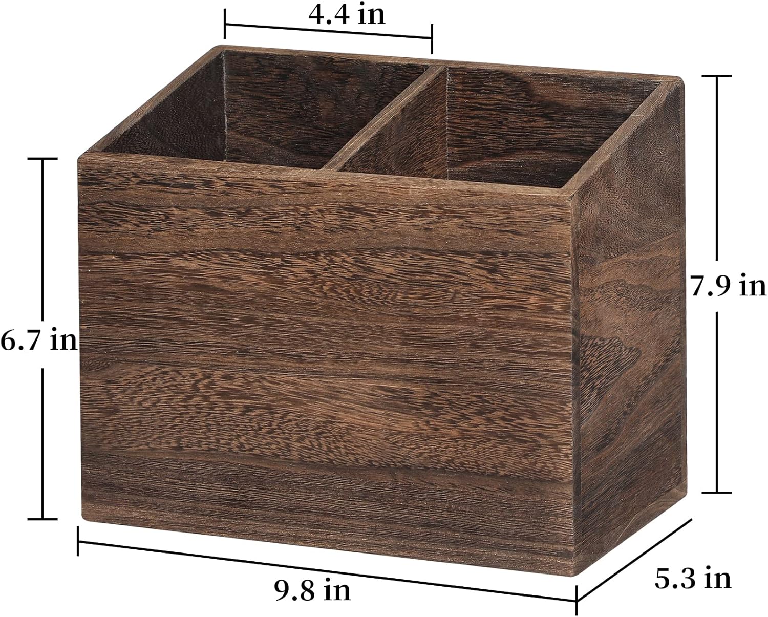 - 【Space Saver for Kitchen】Our large Kitchen Utensil Caddy size is 9.8*7.9*5 in. The Rustic wood Kitchen Cooking Utensil Organizer Box have 2 separate compartments to keep your kitchen utensils neatly in place. Use it for Knives, Spatulas, Tongs, Whisks, Ladles, Skimmers, Peelers, Bottle Openers, Silverware or any other kitchen gadget you want to keep within your arms’ reach