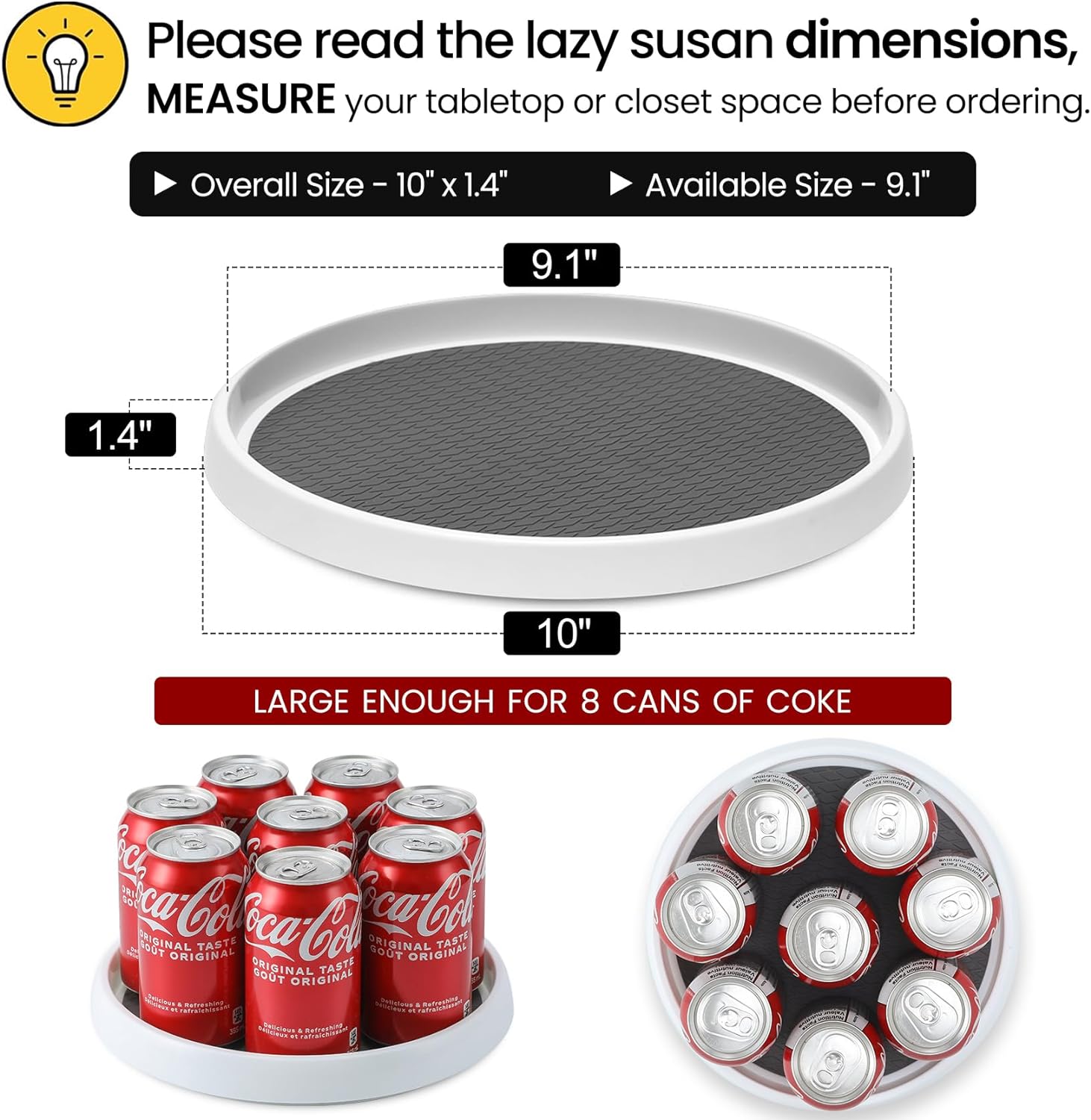 - [ Please Note ] - The lazy susan is large enough for 8 cans of coke (refer to the 2rd image). Please read the lazy susan dimensions and measure your tabletop or closet space before ordering in case it doesn't fit. Overall Size - 10" x 1.4". Available Size - 9.1"