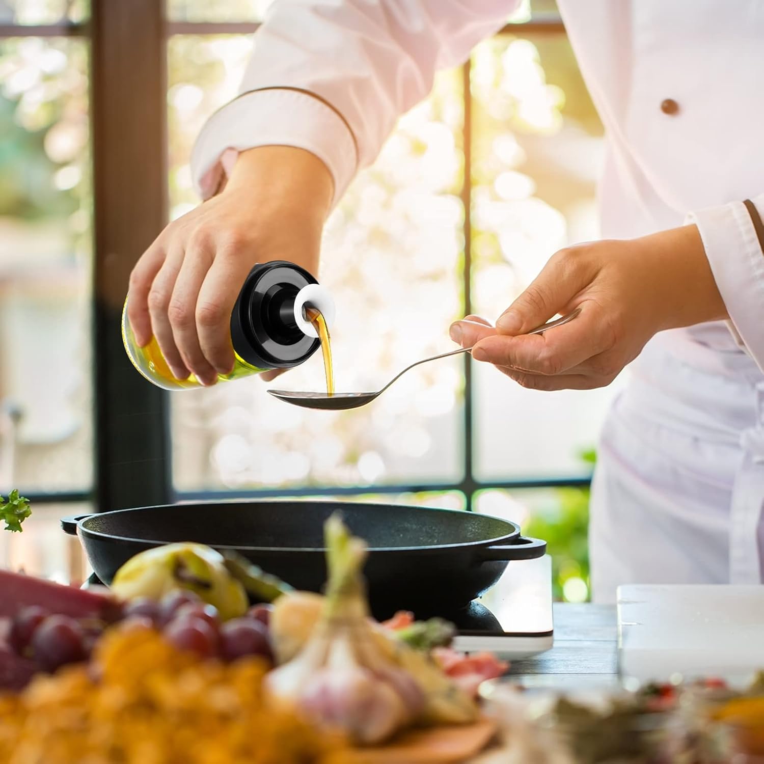 - Practical Leakproof Design: the top of the oil dispenser bottle is designed with a sealing silicone ring, when you put the lid on, these gaskets hold the top of the bottle so that they won't leak even if you inadvertently knock them over while you're cooking, keeping your table clean and tidy; There are small flips along the nozzle to avoid spillage of seasonings and prevent dripping from hanging on the wall