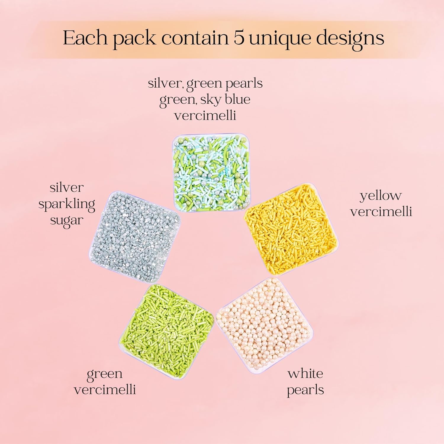 - Confect Sprinkles are made with the finest quality Ingredients & are soft to chew Sprinkles come in a unique pack of 5 assorted colors and sizes.