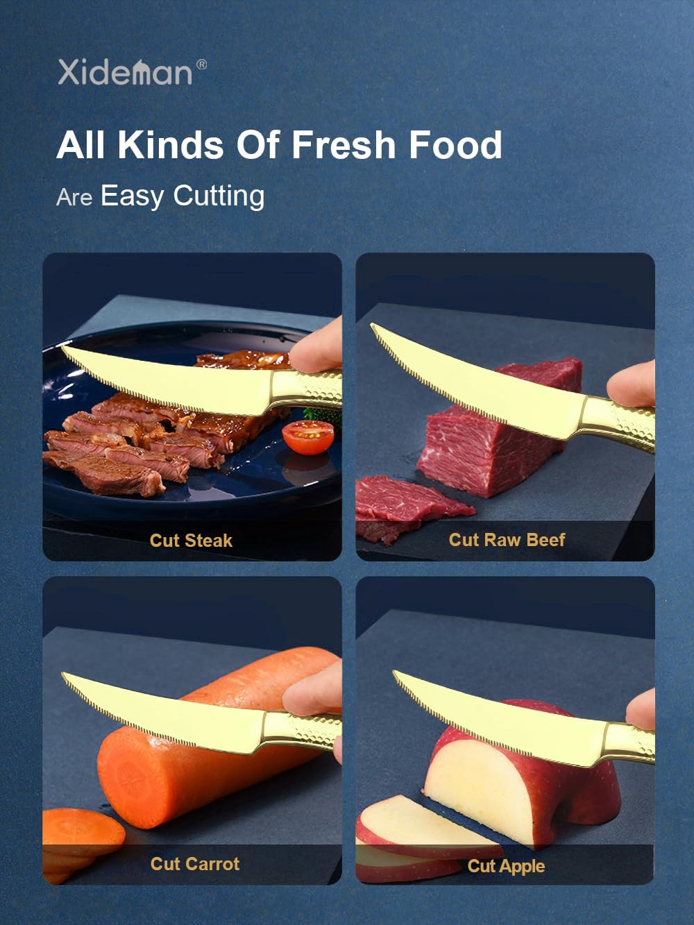 16-Piece Modern Champagne Gold Hammered Silverware Set with Ultra Sharp 2-IN-1 Serrated Knive, Golden 18/10 Stainless Steel Flatware Set, Utensil Cutlery Set for 4 Person, Forks Spoons Knives