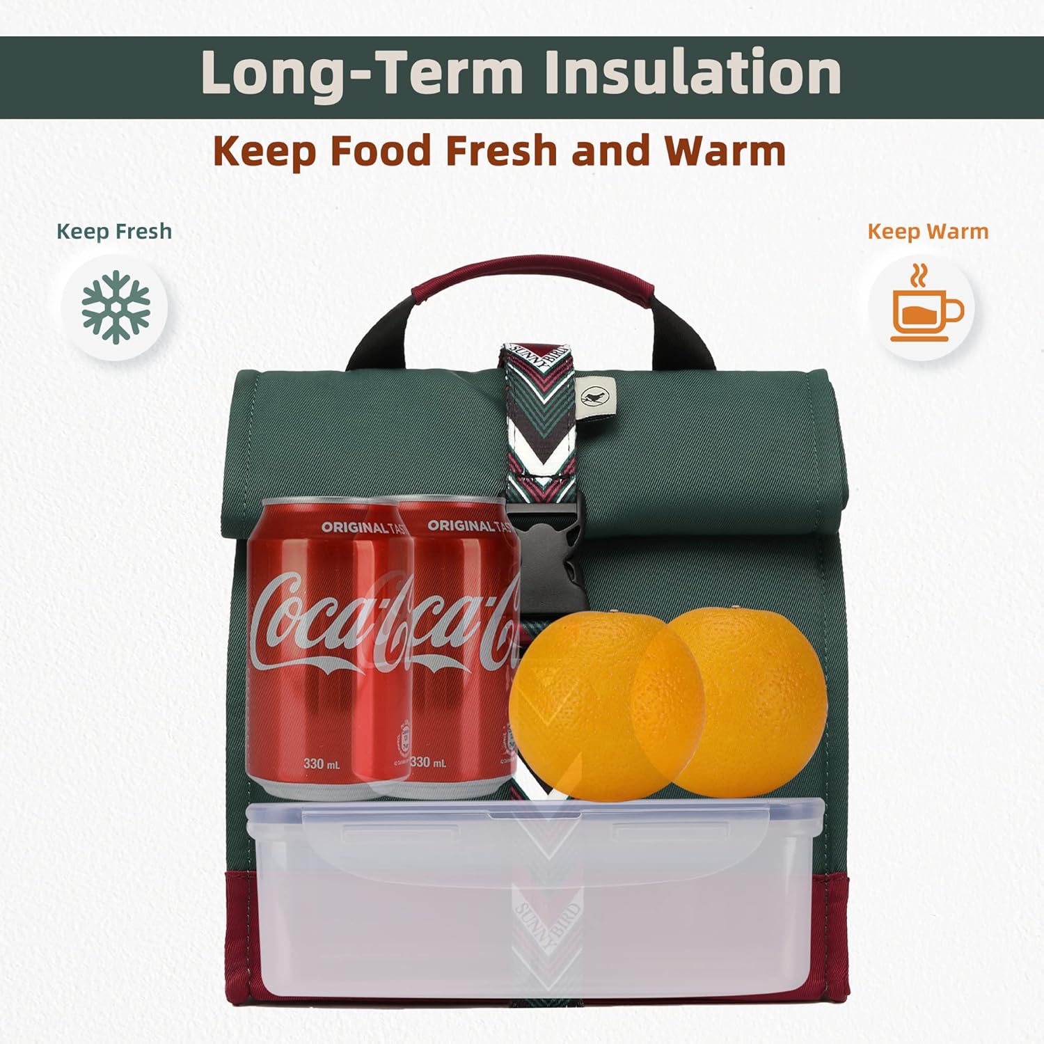 SUNNY BIRD Insulated Lunch Bag Rolltop Lunch Box Tote Bag for Women, Men, Adults and Teens (Green with Boho strap)