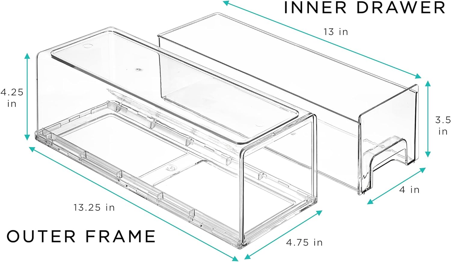 - ✅ Convenient Inner & Outer Sizes for Perfect Fit Each drawer has an inner bin size of approximately [13 x 4 x 3.5] and an outer frame measuring about [13.25 x 4.75 x 4.25], making these organizers ideal for fitting inside most standard refrigerators, cabinets, or pantry shelves.