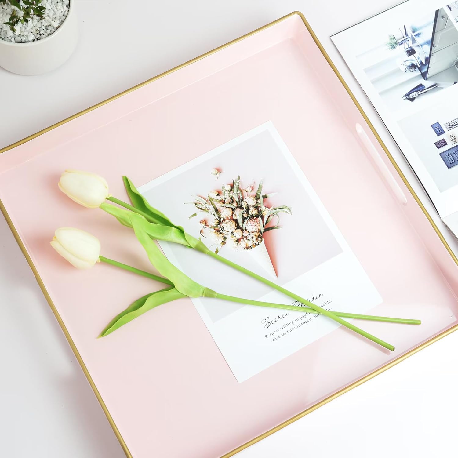 Spsyrine Pink Decorative Serving Tray with Handles, 13" X 13" Square Plastic Coffee Table Tray for Ottoman, Living Room, Bathroom, Home Decor.