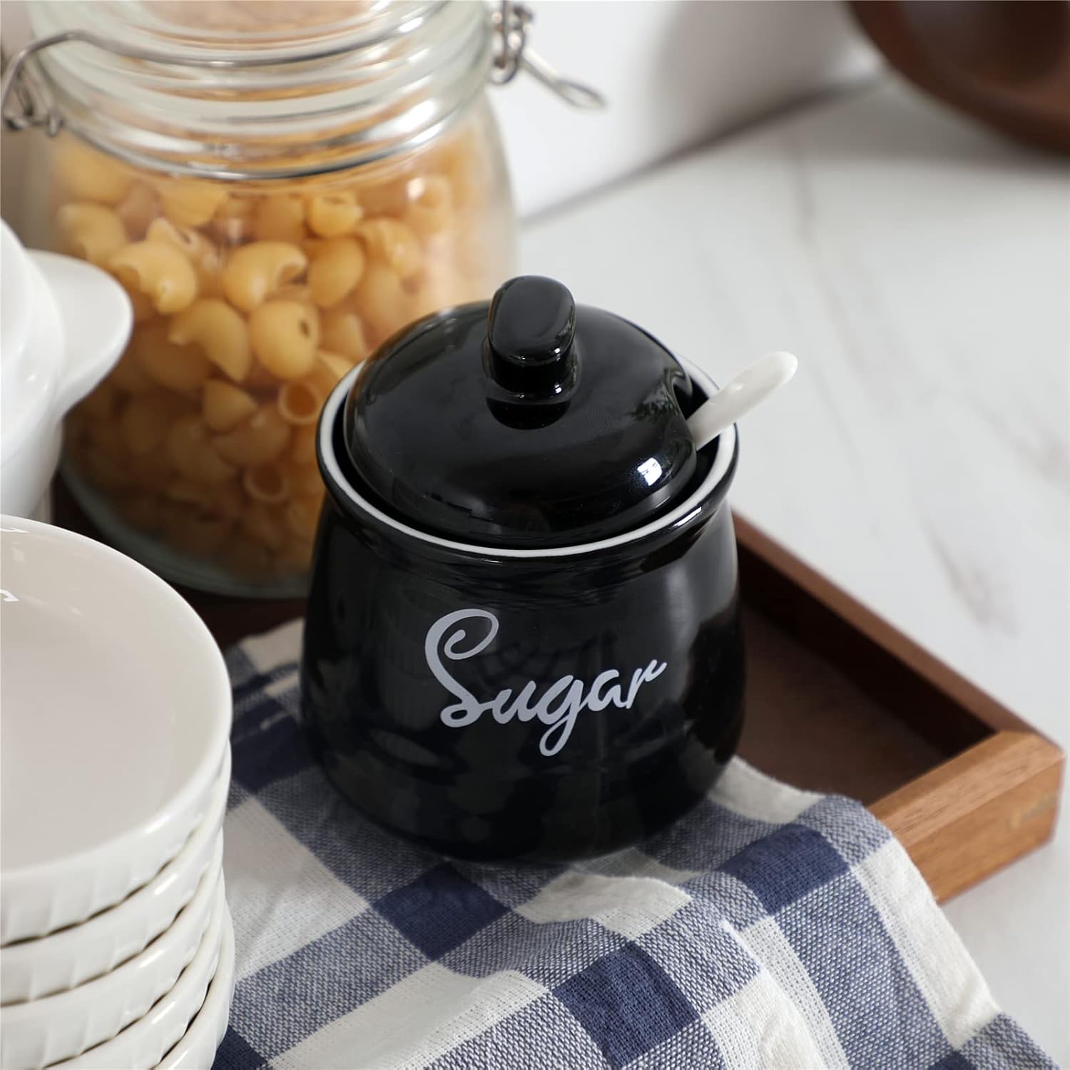 HAOTOP Farmhouse Porcelain Sugar Bowl with Lid and Spoon 12oz,Easy to Clean (Black)