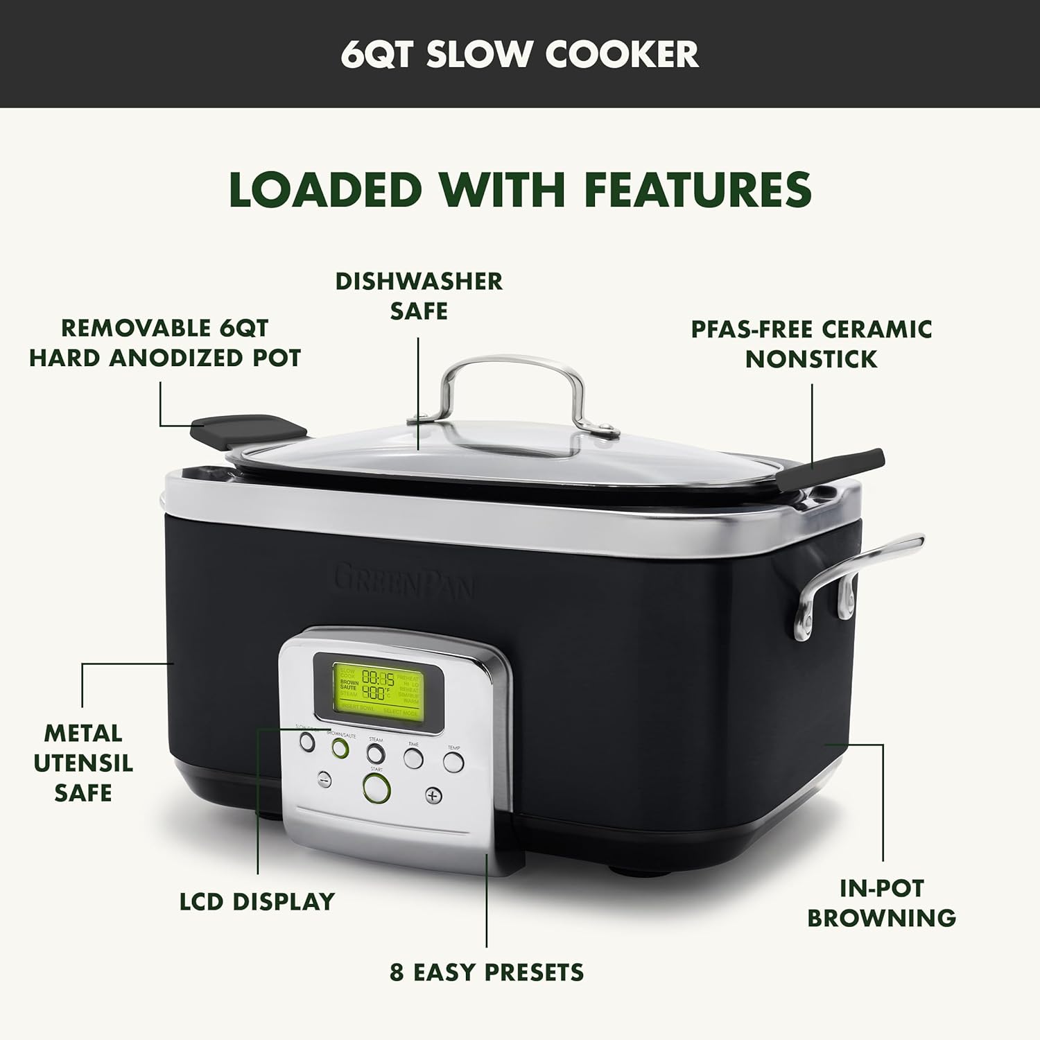 GreenPan Elite 14-in-1 Programmable 6QT Electric Slow Cooker, Dishwasher Safe Lid & Removable Crock, PFAS-Free Healthy Ceramic Nonstick Multi-Cooker, Sear, Sauté, Brown, Steam Basket, Roast, Black