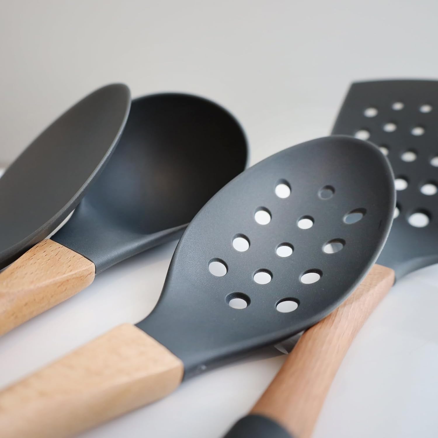 Beille Grey Nylon Spoon with Wooden Handle Kitchen Utensils High Heat Resistance, 13 Inch