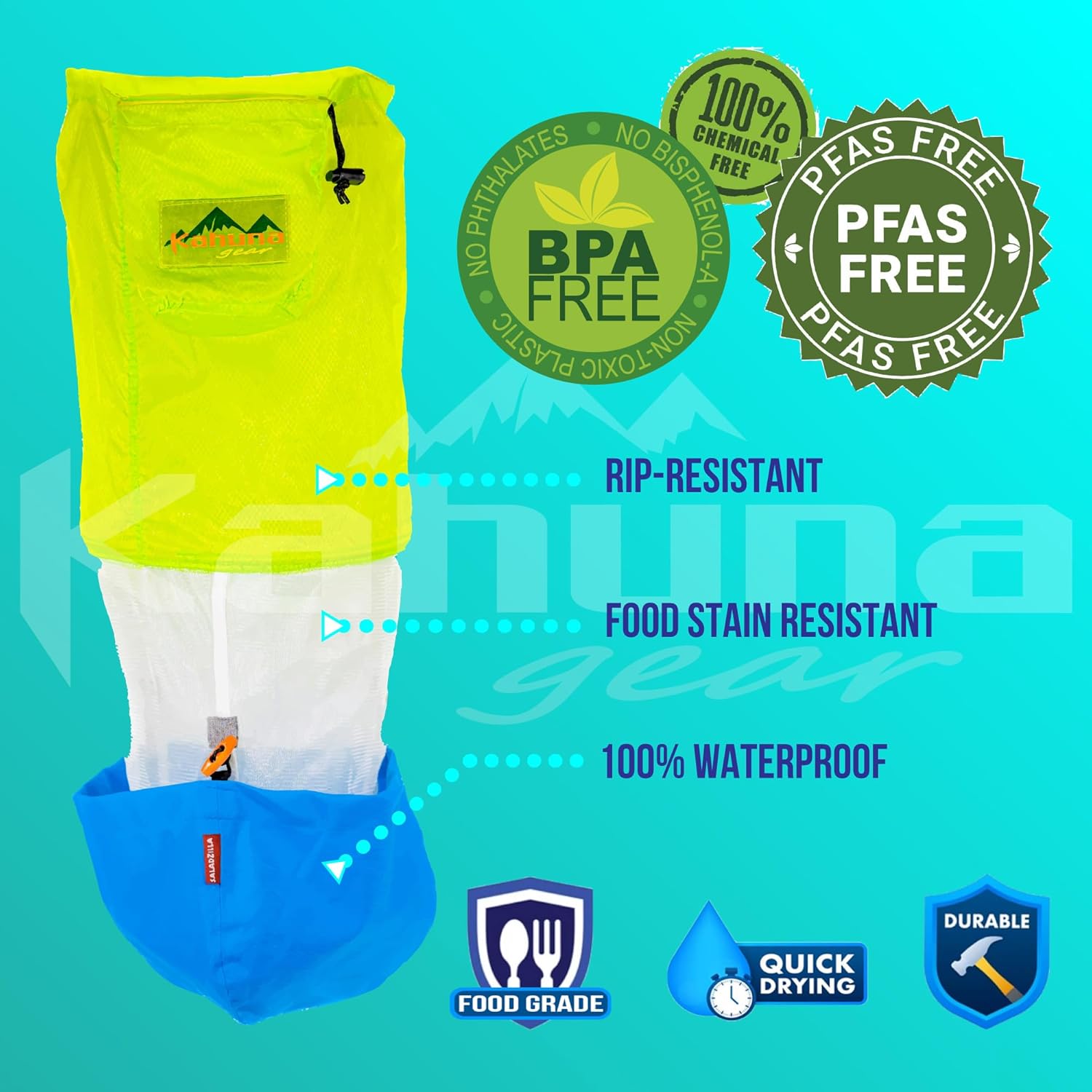 - 🔨DURABILITY - No Plastics to Crack or Mechanical Parts to Break: Saladzilla's made of diamond ripstop fabric. It's the same material used in the high-end backpacking equipment. Hence, tough for the outdoor environment yet light in weight for performance. Our proprietary fabric is free of harmful chemicals and food-safe. It's also quick to dry