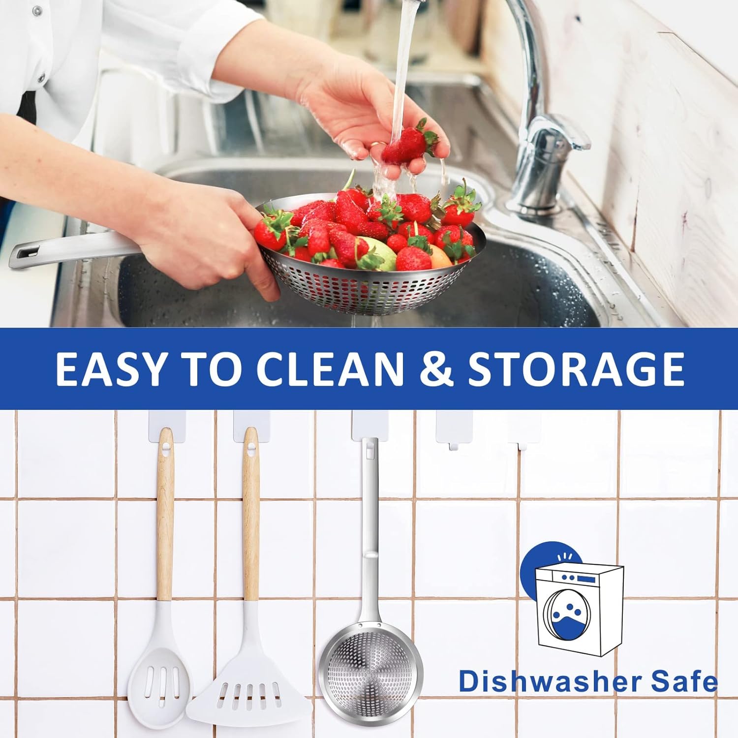 - Strong Skim - Solid filter screen design, use thick stainless steel structure, stronger than other skimmer. Excellent kitchen helper, perfect holidays, birthday gifts for family, friends or kitchen lovers.If you are looking for a practical gift, our large scoop colander is your best choice.