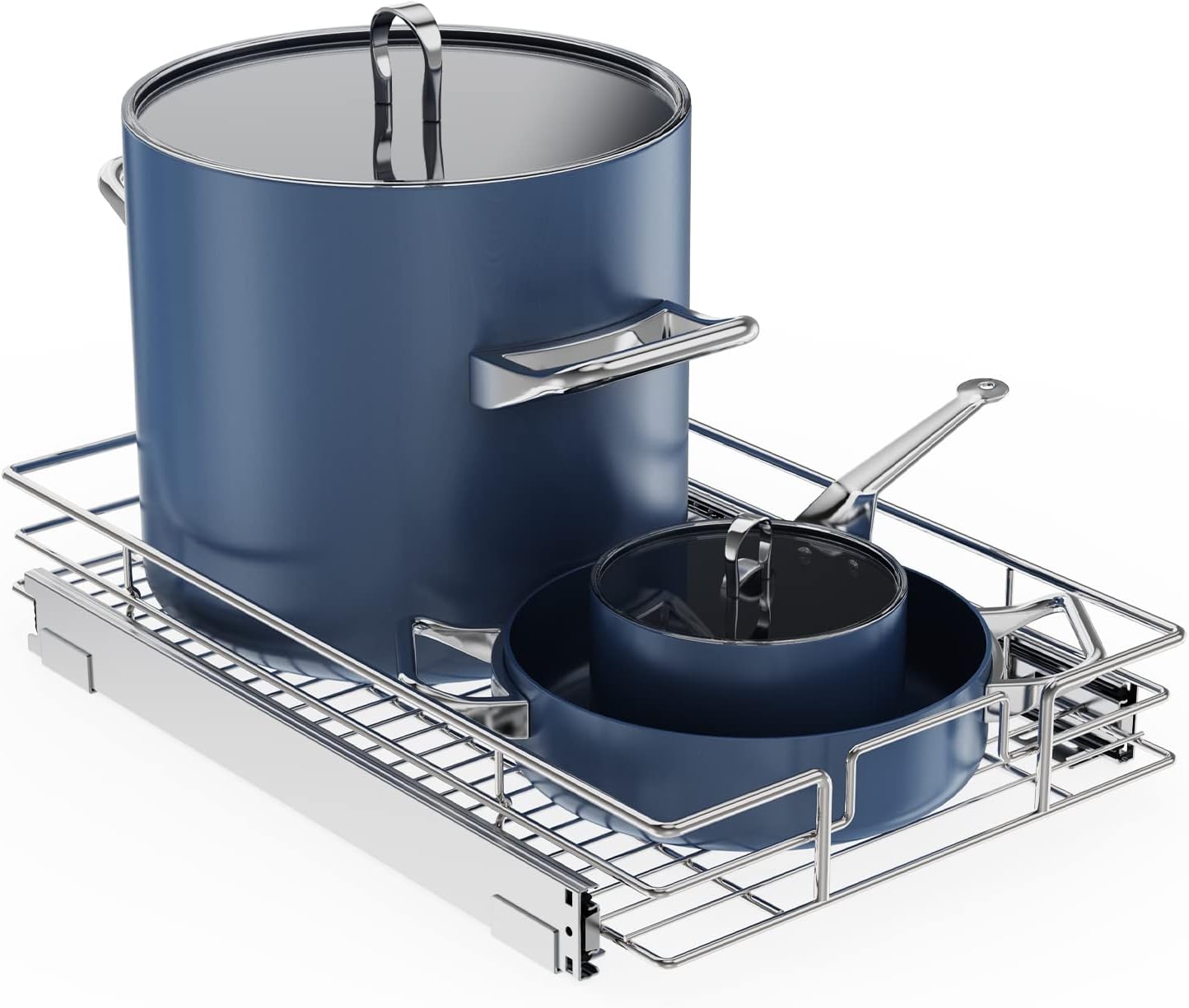 - 【Space-saving Pull Out Cabinet Organizer】This slide out cabinet organizer can maximize your cabinet space. Makes it super easy to store, organize, and access your stand mixers, pots, pans, baking sheets and other kitchen accessories, cleaning supplies, and various odds and ends. Now your cabinet is no longer just stacks of pots pans. You can contact seller via Amazon Messages to make sure if the size fit your cabinet.