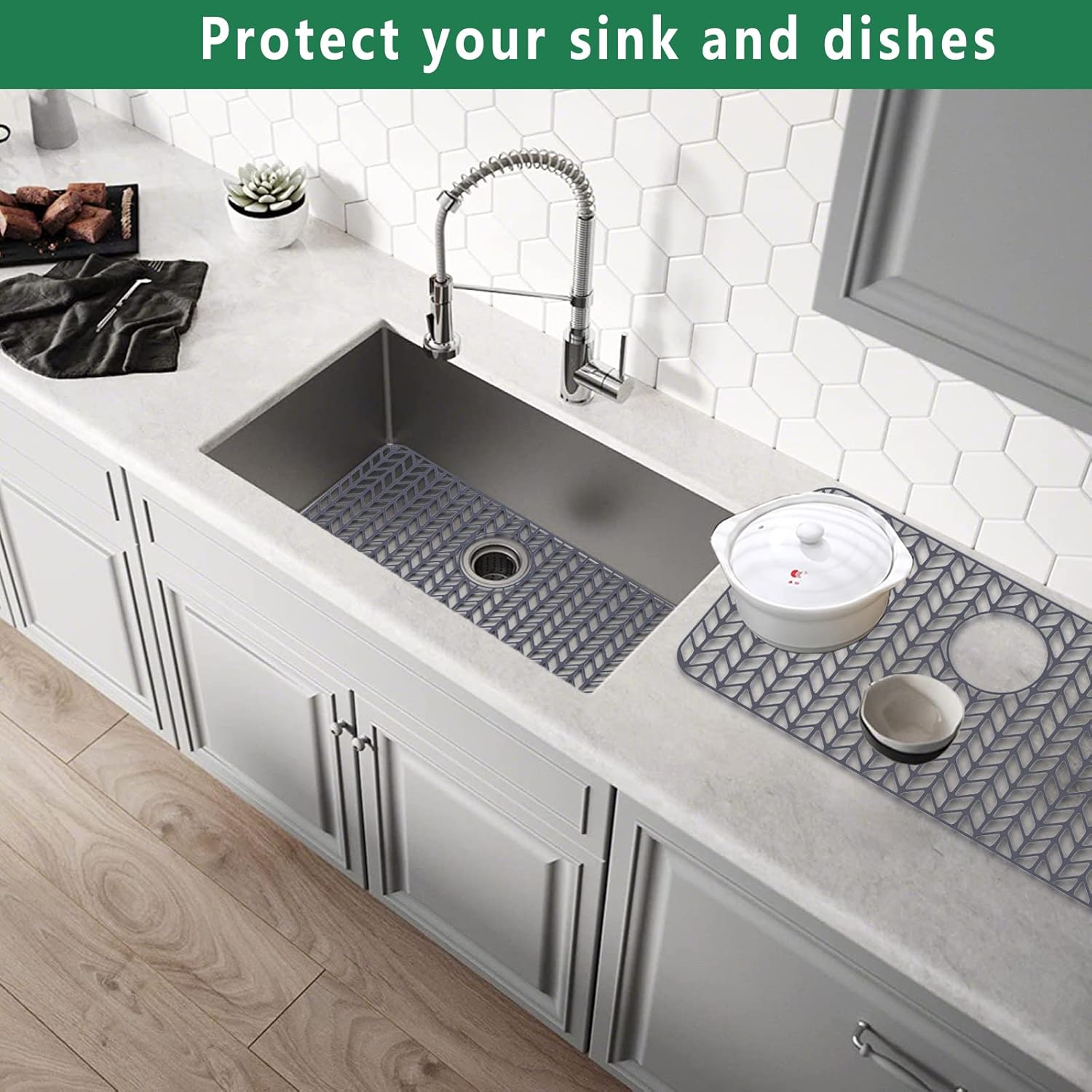 - 【Easy to Use】Our kitchen sink mats and protectors can handle up to 500f, heat-safe silicone for placing pots and pans in sink directly from stove, the superior finish looks sleek, modern and stylish in your kitchen sink.