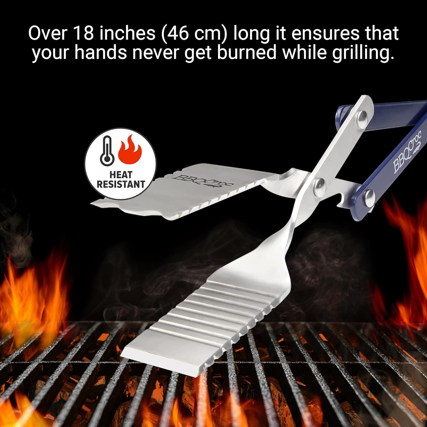 - GRABS, FLIPS & CLEANS. This 3-in-1 tool GRABS like a regular set of tongs. FLIPS like a spatula. Even scrapes your grill CLEAN. The 2 spatulas were designed to be of identical size, to GRAB almost anything with precision and ease. The beveled edges of the spatulas slide easily under stuck-on food. The DUAL SPATULA LOCKING SYSTEM locks on food when flipping on the grill, ensuring increased grilling control.