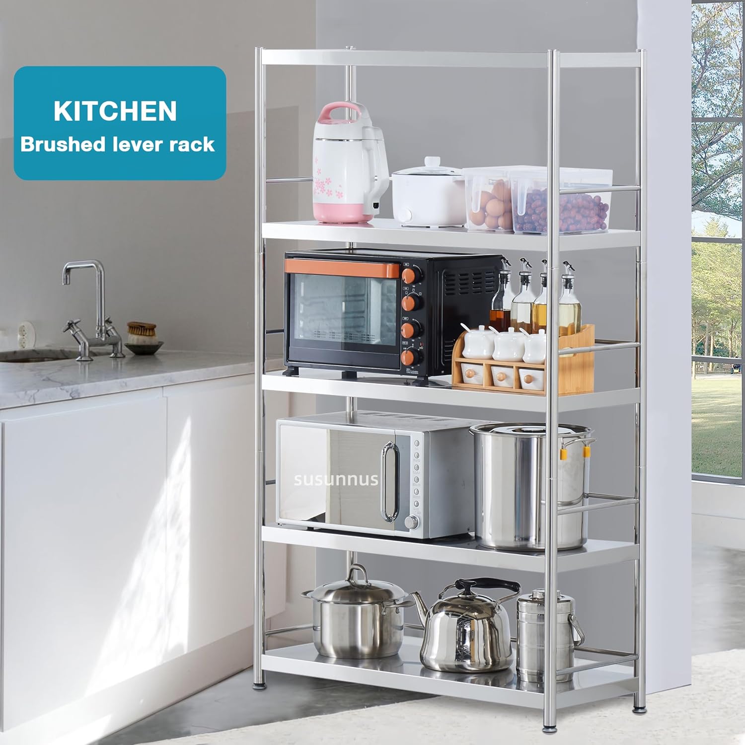susunnus 5-Tier Stainless Steel Shelf, Heavy Duty Shelving for Kitchen, Garage, Industrial Storage, Kitchen Shelves with Guardrails, Adjustable Feet, Easy to Clean