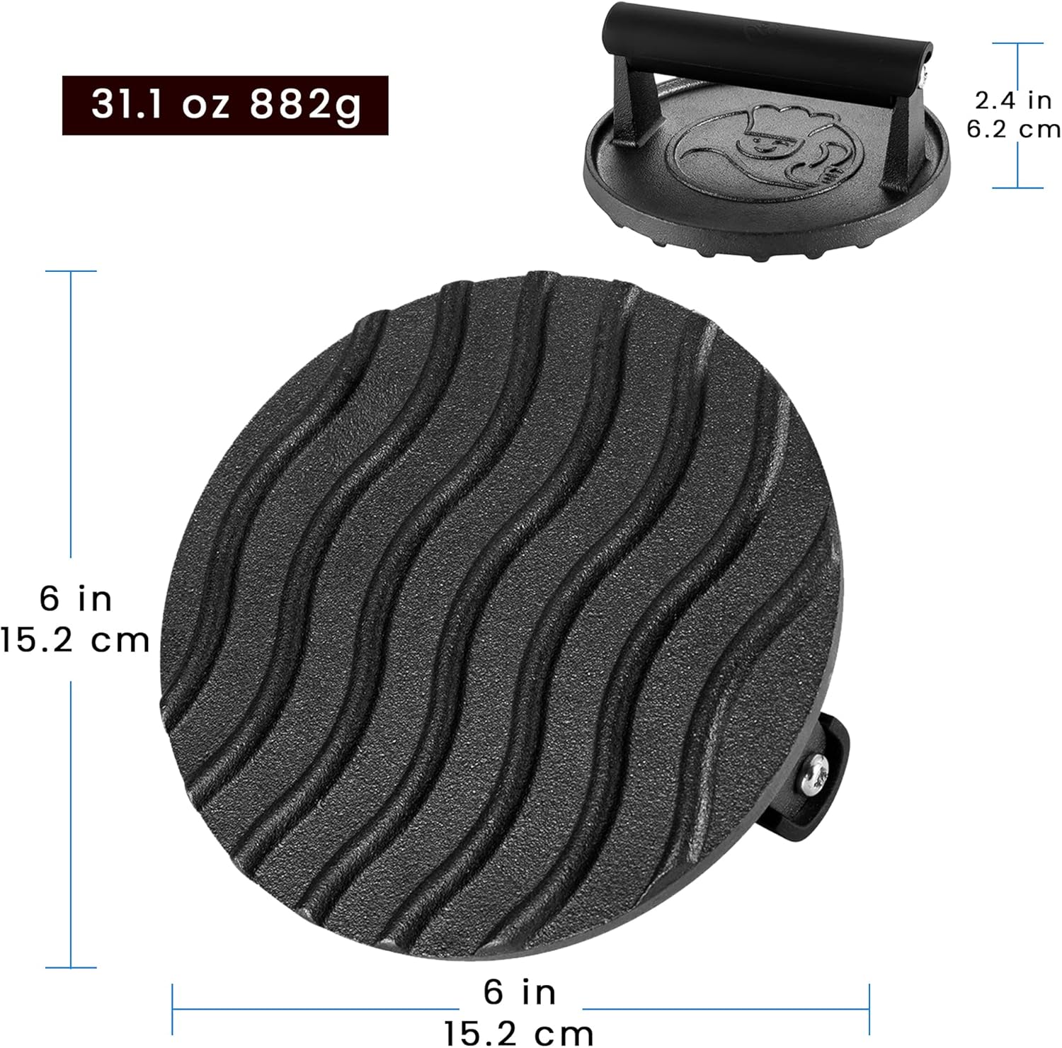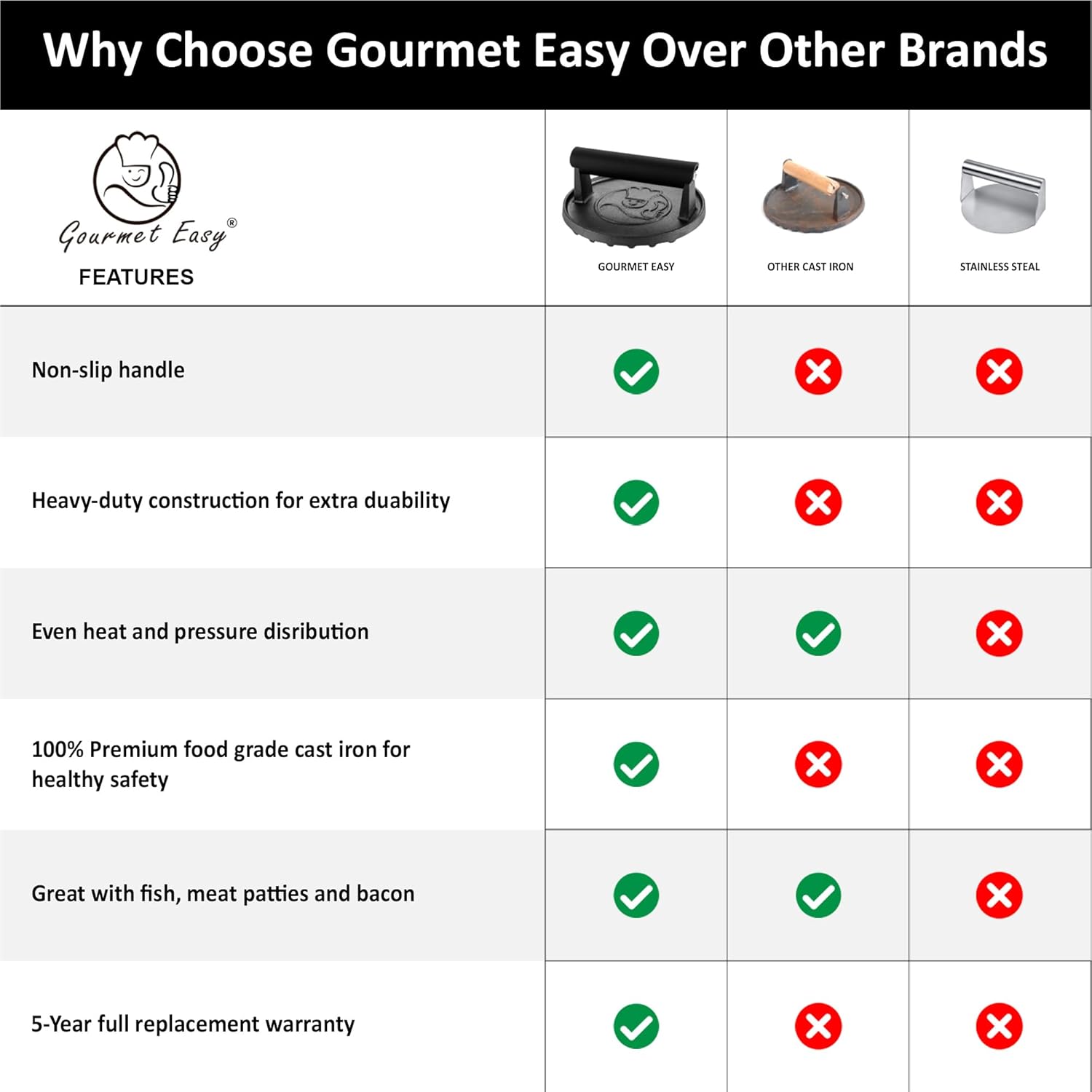 - UNCONDITIONAL 5-YEAR WARRANTY - This cast iron burger press comes with an unconditional 5 years warranty. Why? Because this cast iron cookware is built to last. We use only the highest grade material and innovative design to ensure that it will last a lifetime!