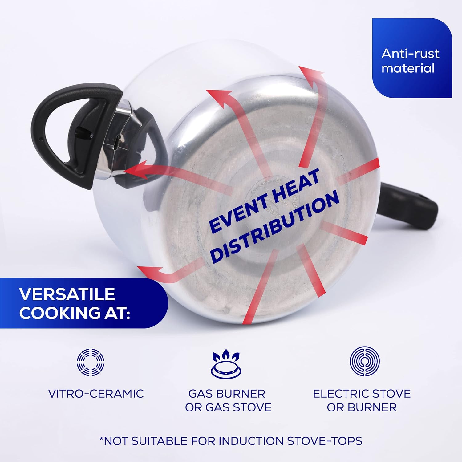 - Durable 4.2 Qt Aluminum Pressure Cooker – Inner Lid System for Secure Sealing: This high-quality 4.2 Qt (4L) aluminum pressure cooker features a traditional inner lid closure system for safe and efficient cooking. Its heavyweight build ensures stability at 11.60 PSI (80 kPa) with extra safety mechanisms. IMPORTANT: To insert the lid, align the lid arrow with the body handle, tilt and slide it in, turn the handle, place it on the pivot, squeeze both handles together, and adjust for a perfect seal.