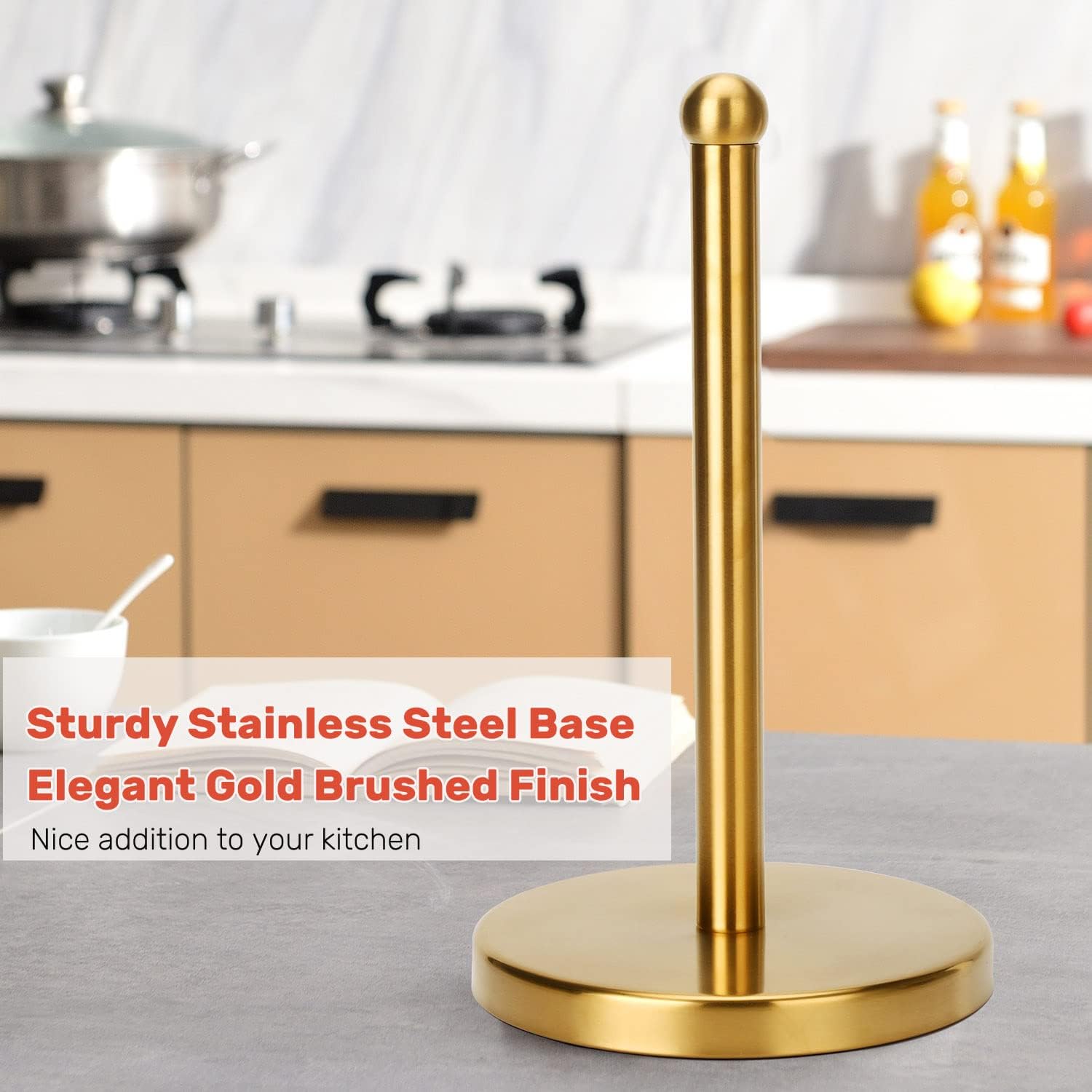 - Nice Addition To Kitchen. Made from gold brushed stainless steel, the paper towel holder countertop is good looking and elegant. It is not only a practical free standing paper towel holder, but also a great item which is convenient to use in your daily life.