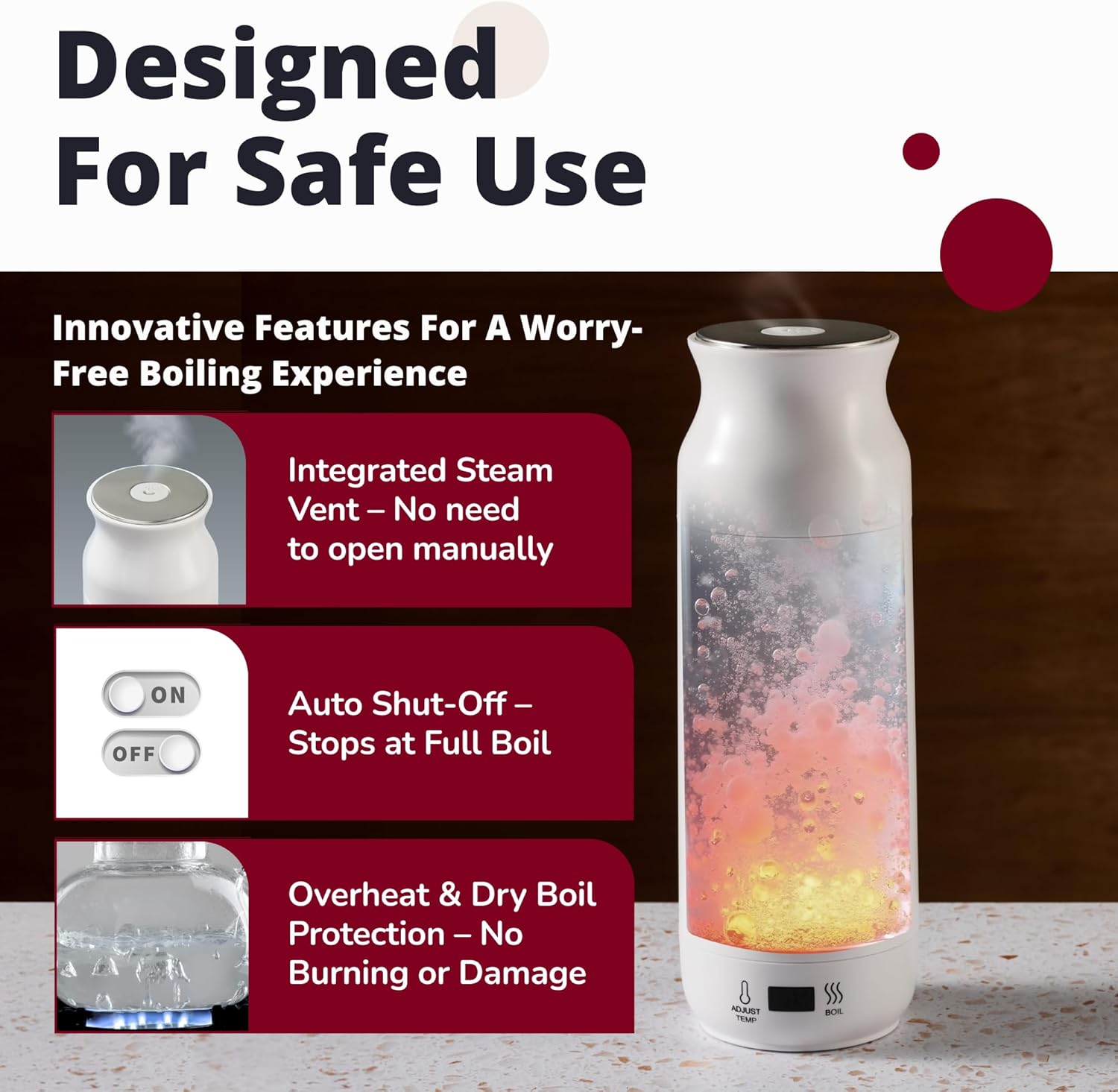 - Safety First - This small electric kettle automatically turns off once the water boils. Housed in a durable shell, this water heater kettle also has overheat protection and dry-boil safety features.