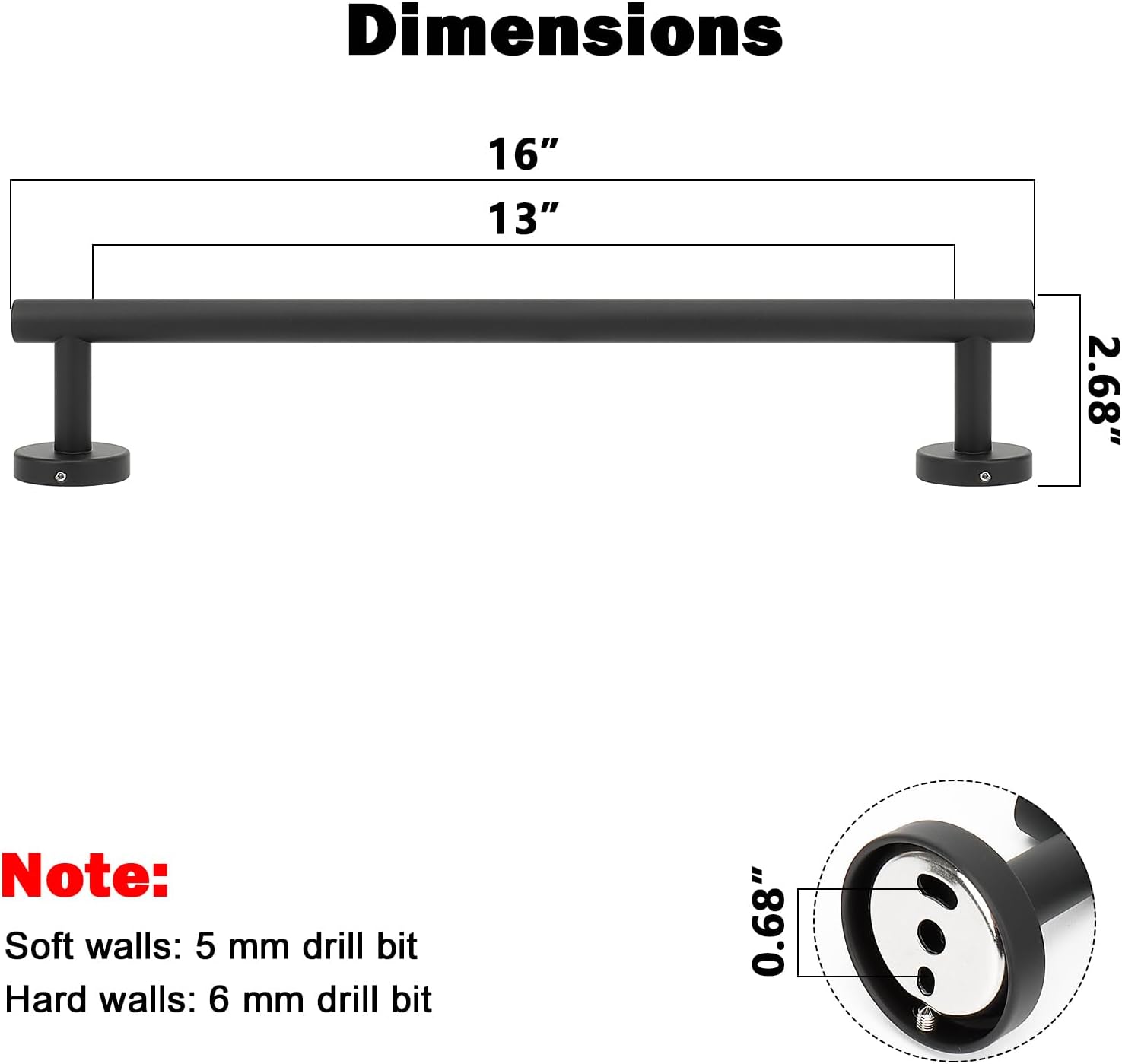 - DIMENSIONS & USE: Overall length is 16" (405mm). The length of hanging space is13" (340mm). 22-Lbs (10kgs) max weight capacity. You can mount this towel bar to either side of your cabinet or closet door for storing at-use hand and dish towels. It can also be used with S hooks, hanging bath balls, hair dryers, tea cups, spoons, clips, etc.