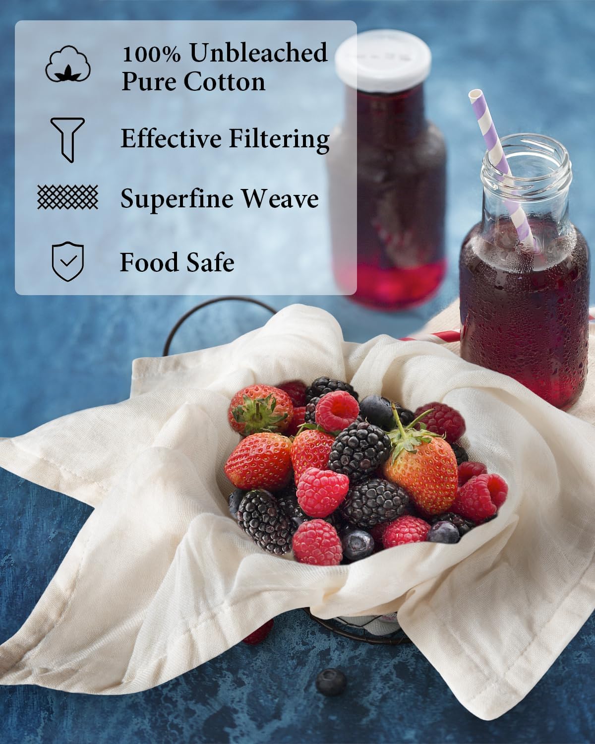 - Holds Up to Daily Use - The size (20x20 inches) and tightest weave of cheesecloth answers filtering needs of most foods in life. It is the finest cheesecloth for straining Cheese, Butter, Creamy Yogurts, Nut Milk, Soup Stocks, Almond Milk, Jelly, Coffees, Fruit, Honey, Tea and more.