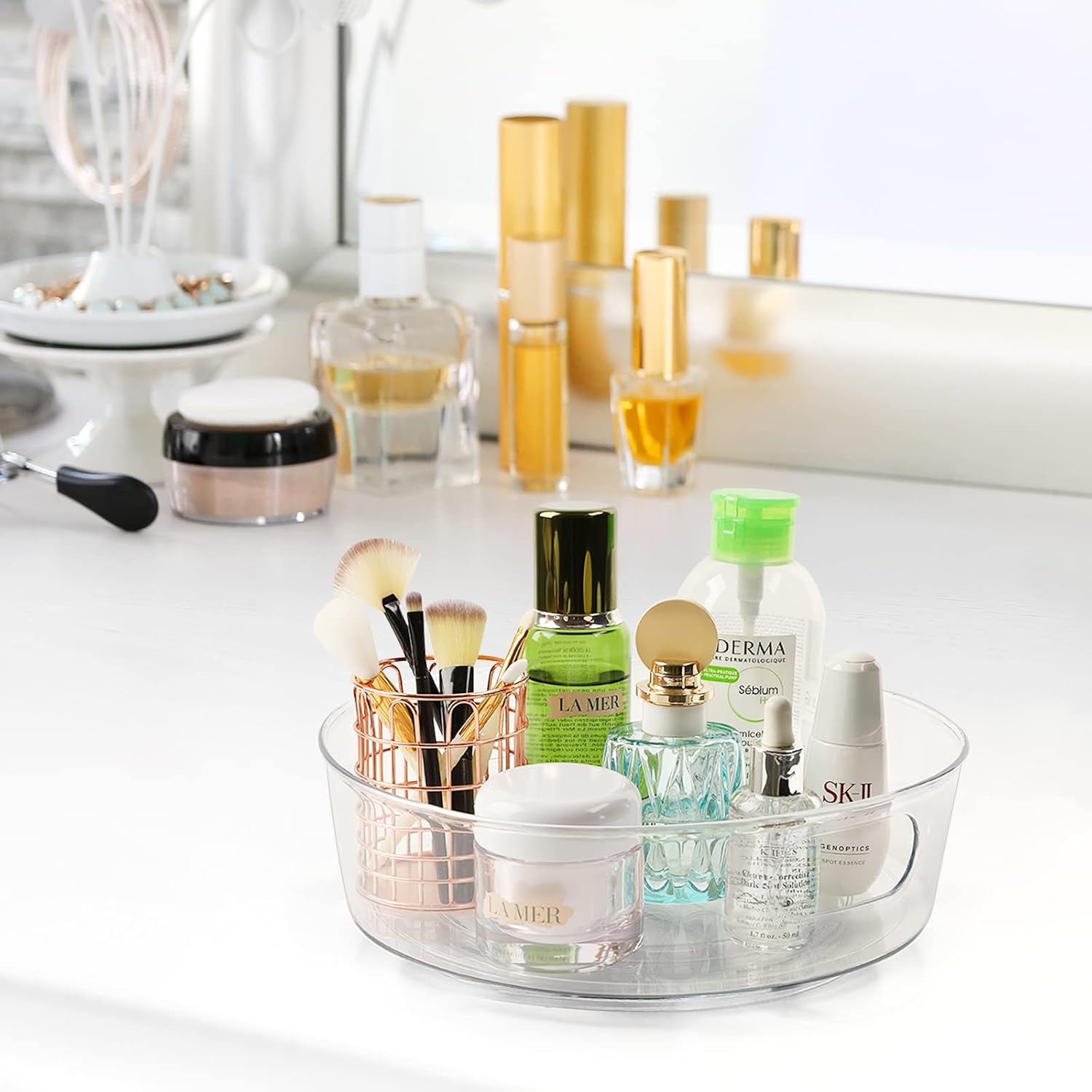 - Handle Design & Visible Clear - The spinning tray designed with two built in handles, make it easy to carry and move to anywhere you want. And the clear side allows you to see all your items at a glance and find what you are looking for without pulling them out