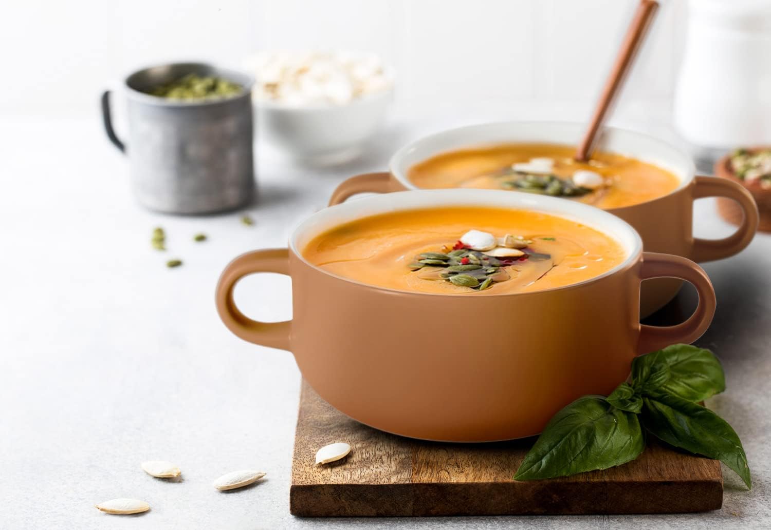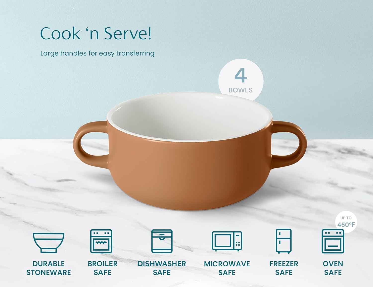 Kook Soup Crocks, Ceramic Bowls, Broil, Oven, Microwave and Dishwasher Safe, with Handles, For Casserole, Pasta, Cereal, 18 oz, Set of 4 (Caramel)