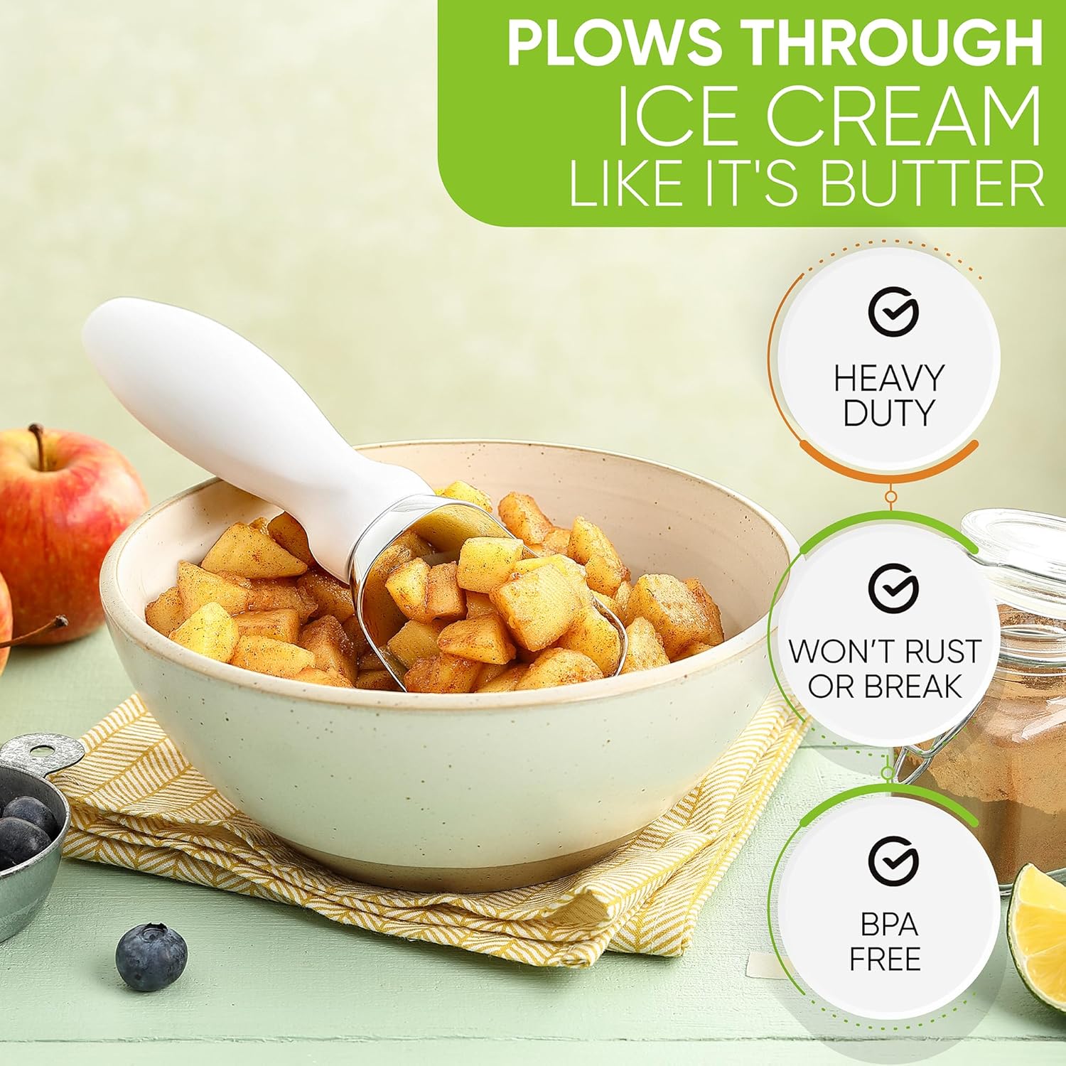 - Plows Through Ice Cream Like It's Butter - Glides smoothly and easily through hard-packed frozen sweets. It will seem like ice cream flows right into the scoop and drops into your bowl or cone with little to no effort.