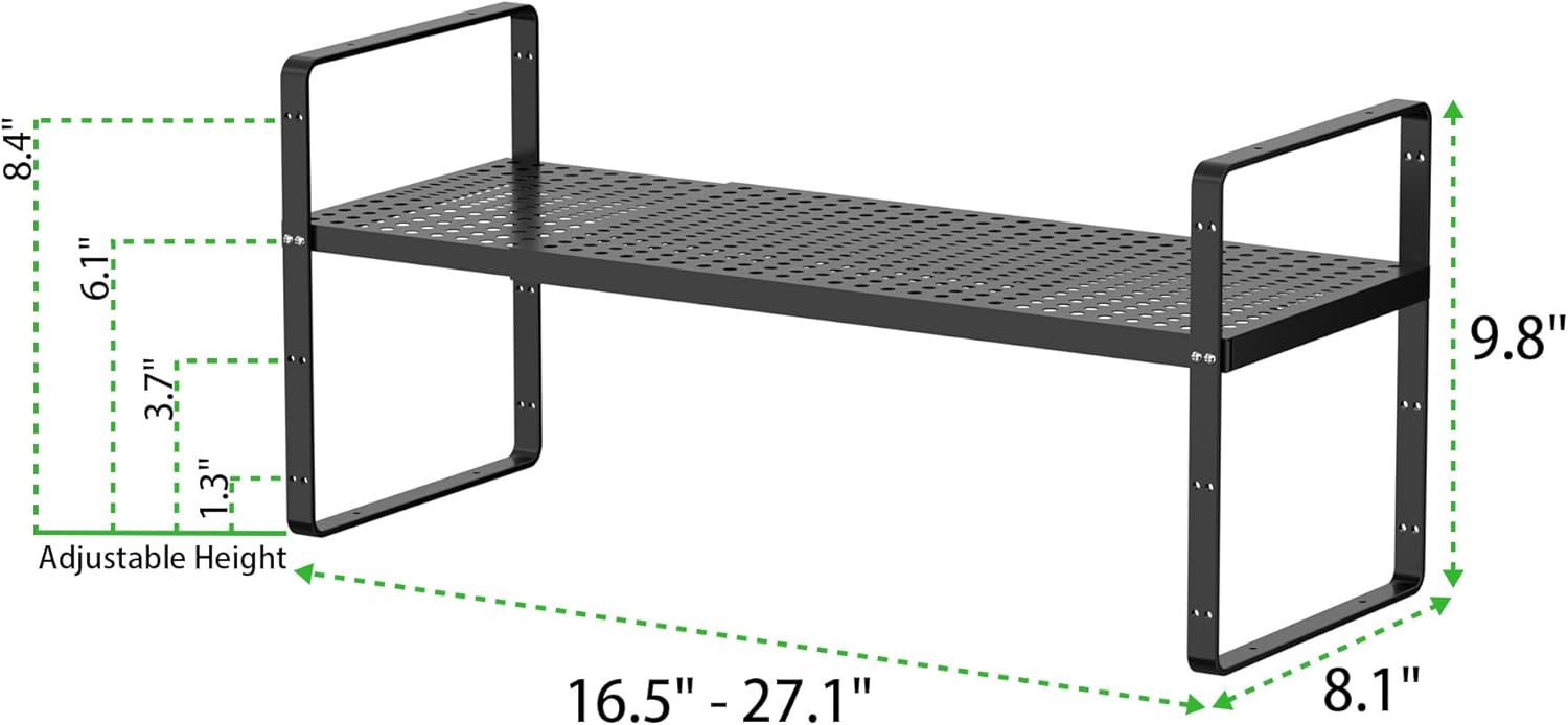 - Adjustable Shelves: This cabinet shelf organizer extends in length and adjusts in height to fit any space you need. The original shelf (collapsed) measures 16.5" L x 8.1" W x 9.8" H. The length can be extended from 16.5 inches to 27.1 inches. This expandable cabinet shelf provides three levels of board height adjustment from 5.7 inches to 8.5 inches. You can tailor each shelf with adjusting screws on both sides of the shelf frame.