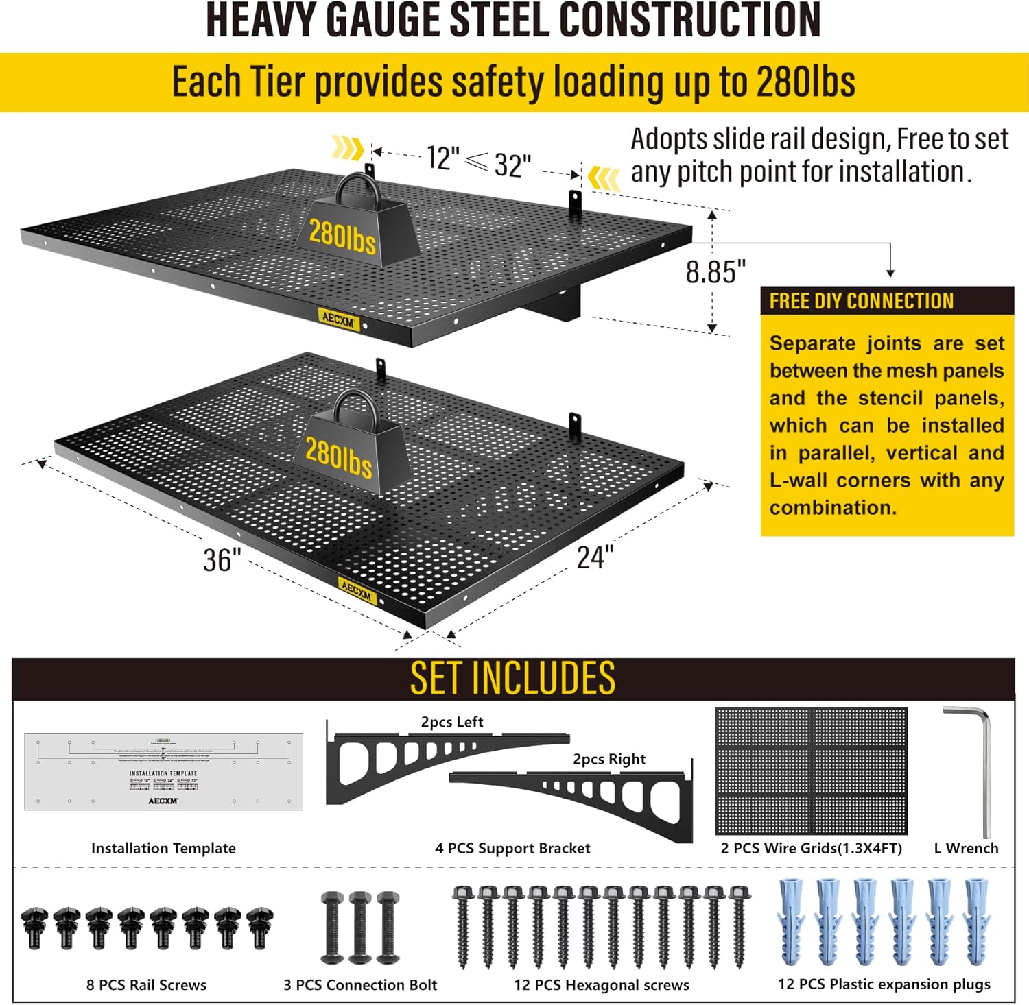 - Premium Craftsmanship: This garage wall shelving is crafted from a single steel sheet, precision-stamped and folded for strength. Unique high-density hole design enhances functionality while delivering a sleek, modern aesthetic