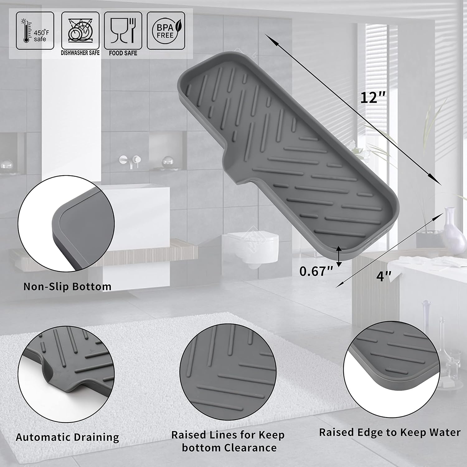 - Food Grade Silicone: The soap dispenser tray is made from high-quality food grade silicone, so it's safe for use in the kitchen or bathroom