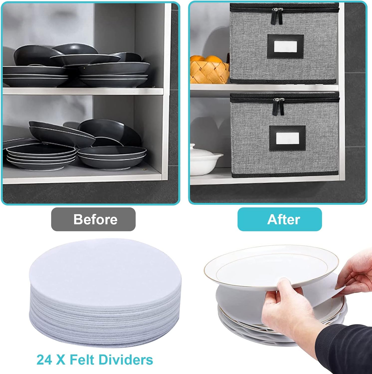 - 🍽Product List:Contains two dish storage containers.Total 24 Felt Plate Dividers presented.It is 12''L*12''W*8''H and can hold up to 12 pieces of 12" (or smaller) diameter dishes.