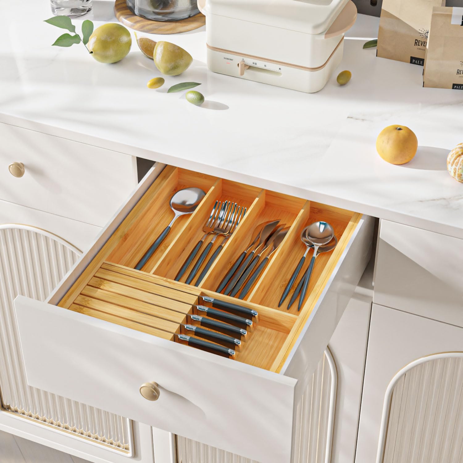 - 【3-in-1 Organizer】: Kitchen Drawer organizer with steak knife holder, no assembly required. It can store kitchen utensils, knives and silverware together, which can effectively complete the kitchen organization work and keep your tableware in order, beautiful and tidy.