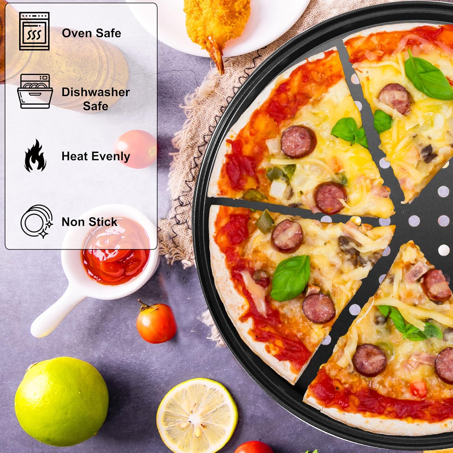- High-quality Pizza Pan: The surface of the carbon steel pizza pan is designed with a non-stick coating, which is easy to release food and clean the tableware. It has good thermal conductivity and has multiple holes on the surface to help you quickly and evenly transfer heat to your food.