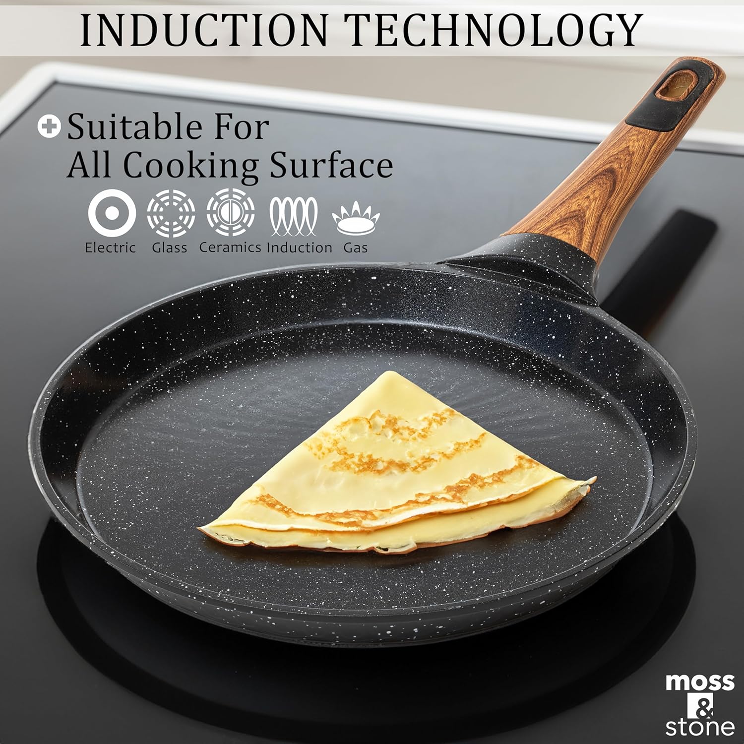 Moss & Stone 9.5 Inch Nonstick Crepe Pan with Spreader, Dosa Pan for Roti Dosa Tawa Comal Para Tortillas, Ceramic Flat Skillet Pan Induction Compatible, Pancake Pan for Stove Top - Black