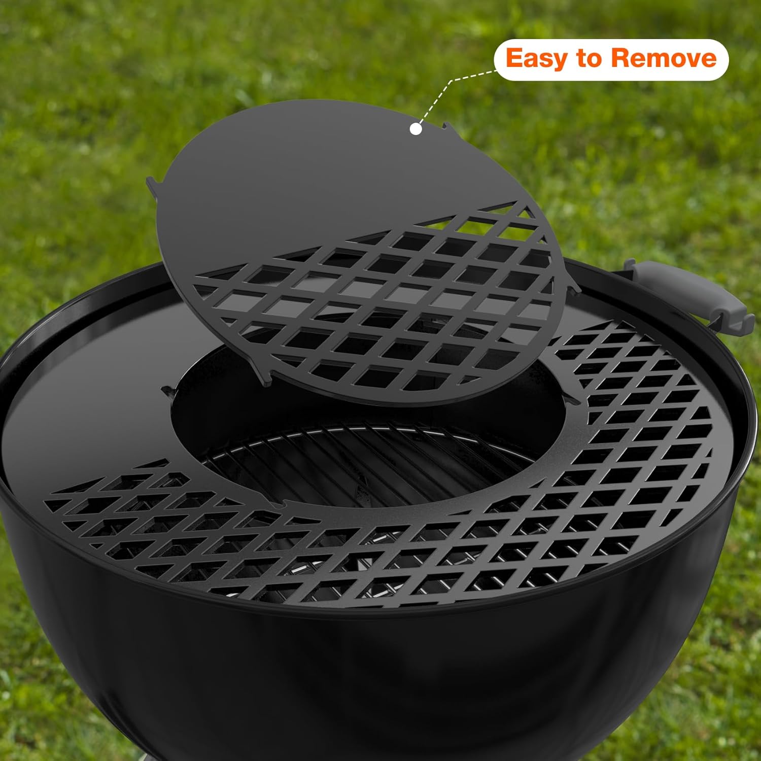 - 【Removable Central Sear Grate】The inner sear grate with raised side handles makes it easy to add charcoal while grilling, no need to remove the outside grate, perfect for traditional grilling.
