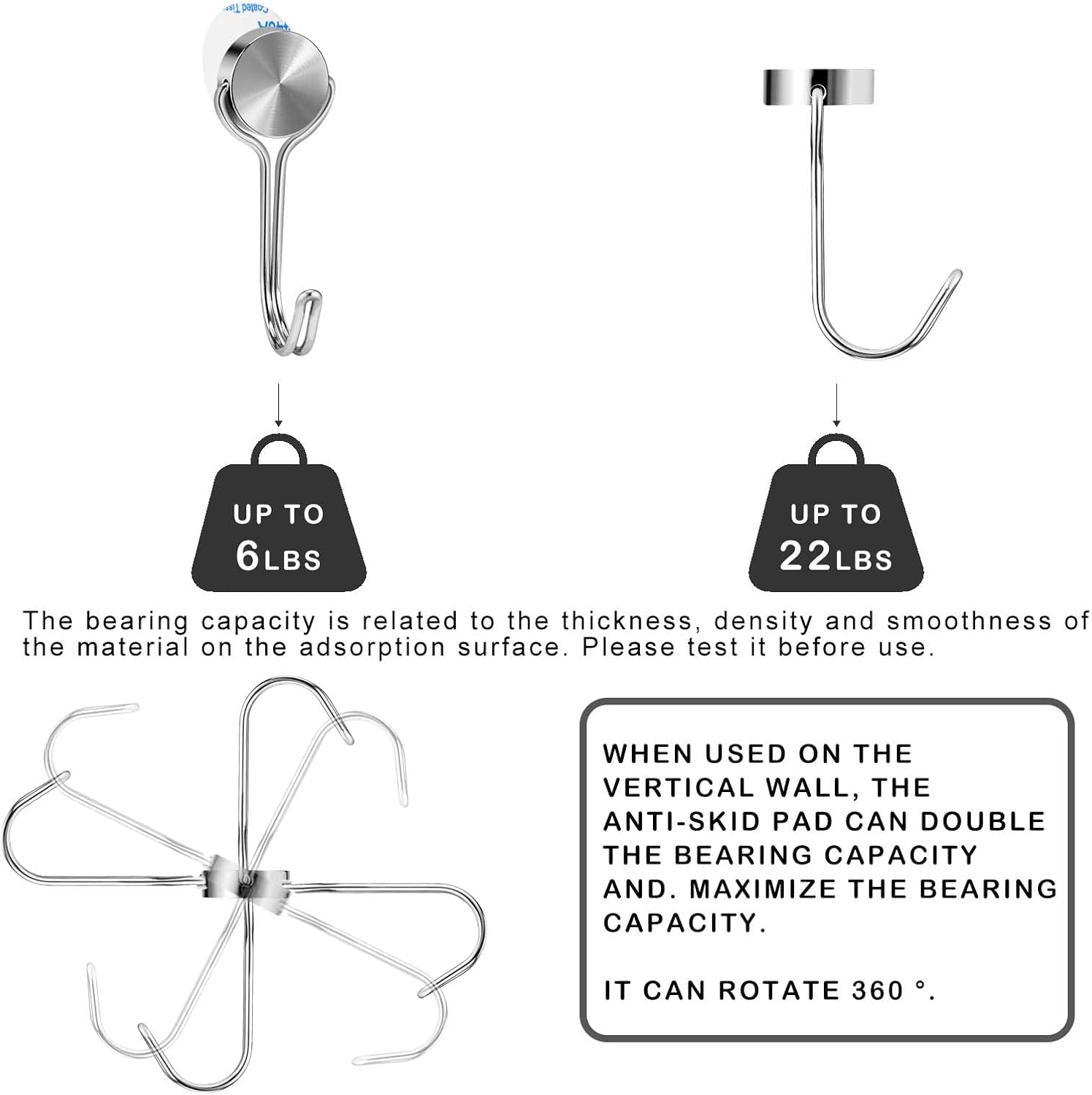 - 【Equipped with Non-slip Pad】Using with anti-slip pads which enables magnetic hook to bear more weight when use horizontally, such as refrigerators and iron doors, the load-bearing capacity can be double, so no need to worry about items slipping off. The maximum load capacity is 22LBS for horizontal walls and 6LBS for vertical walls.